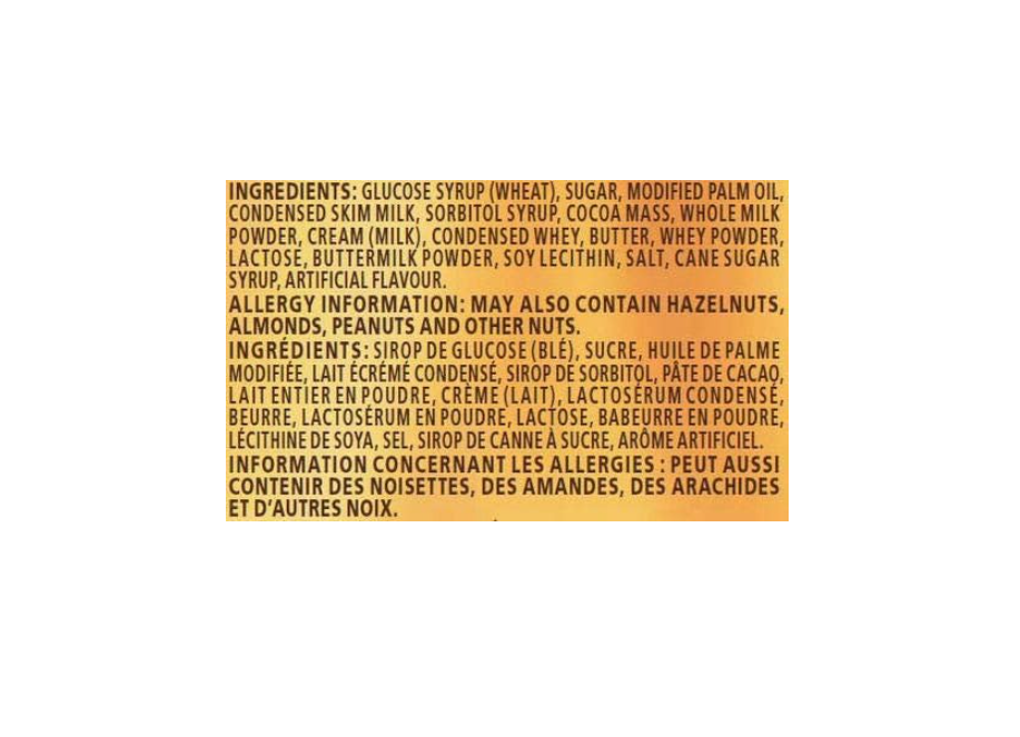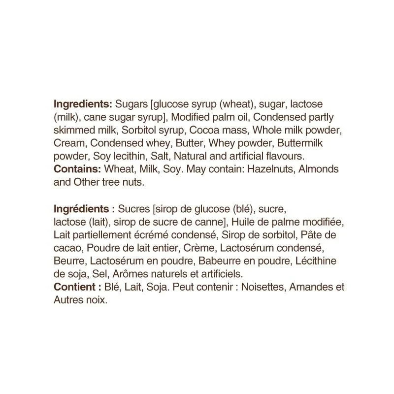 Sugars [glucose syrup (wheat), sugar, lactose (milk), cane sugar syrup], Modified palm oil, Condensed partly skimmed milk, Sorbitol syrup, Cocoa mass, Whole milk powder, Cream, Condensed whey, Butter, Whey powder, Buttermilk powder, Soy lecithin, Salt, Natural and artificial flavors. Contains: Wheat, Milk, Soy. May contain: Hazelnuts, Almonds and Other tree nuts.