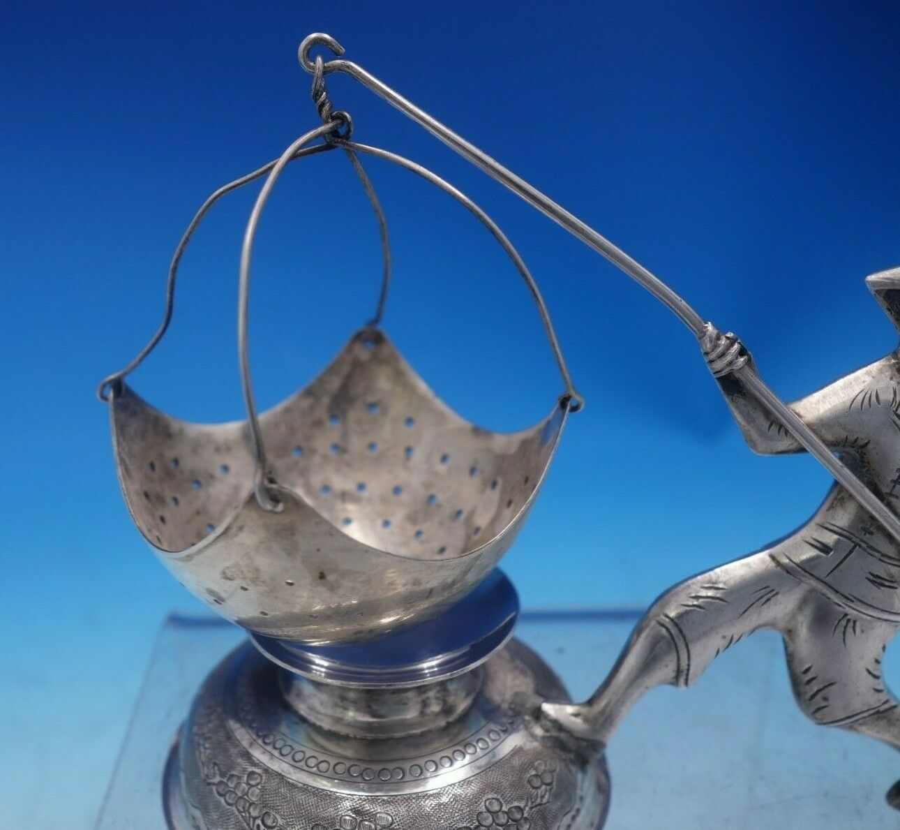Extraordinary .900 silver tea strainer with figural man and fishing pole with net/basket-shaped strainer (maker unknown). It was made in Hanoi, Vietnam. This piece measures 3 1/2" tall x 4 1/2" and weighs 1.95 troy ounces. It is not monogrammed and is in good vintage condition. Captivating piece!