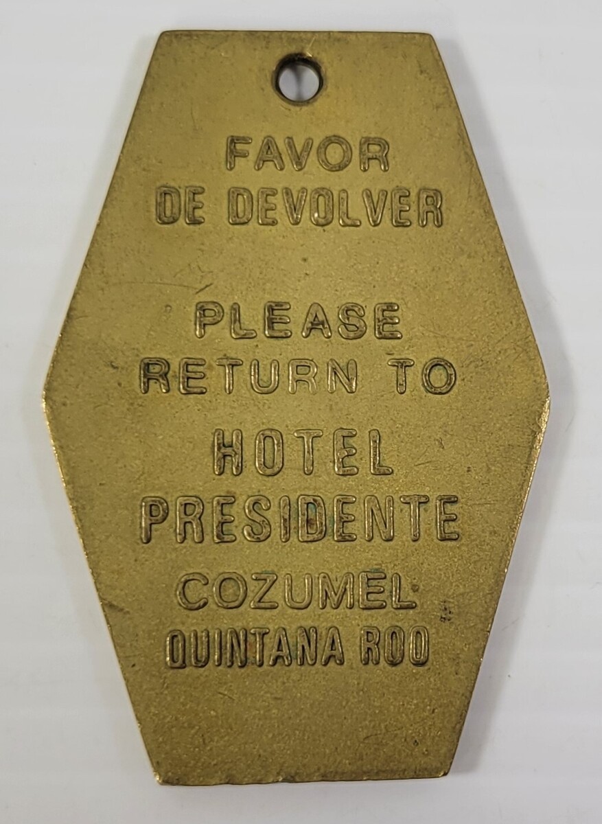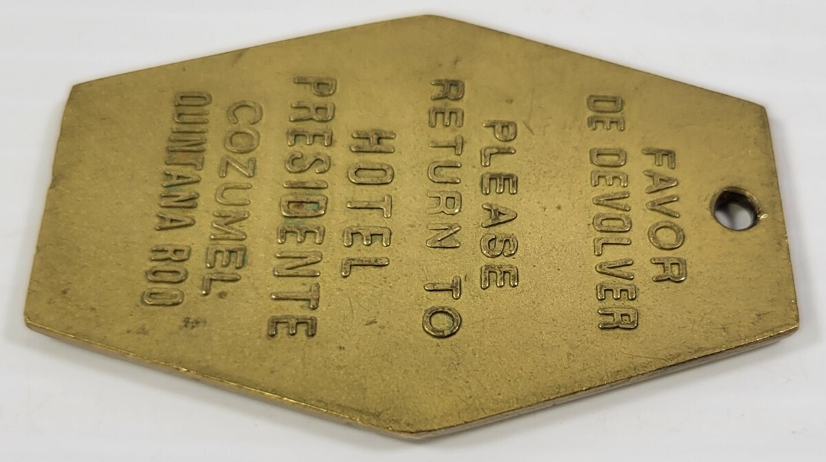 Rare Vintage Hotel Presidente Metal Room Key Fob Chain Cozumel Island, Quintana Roo, Mexico Brass fob used for room key prior to renovation which upgraded to card lock system Measures about 2-5/8" x 1-3/4" Heavy brass metal Fob is in overall good vintage used condition with slight possible tarnish due to age. Listing is for fob only with NO KEY included.