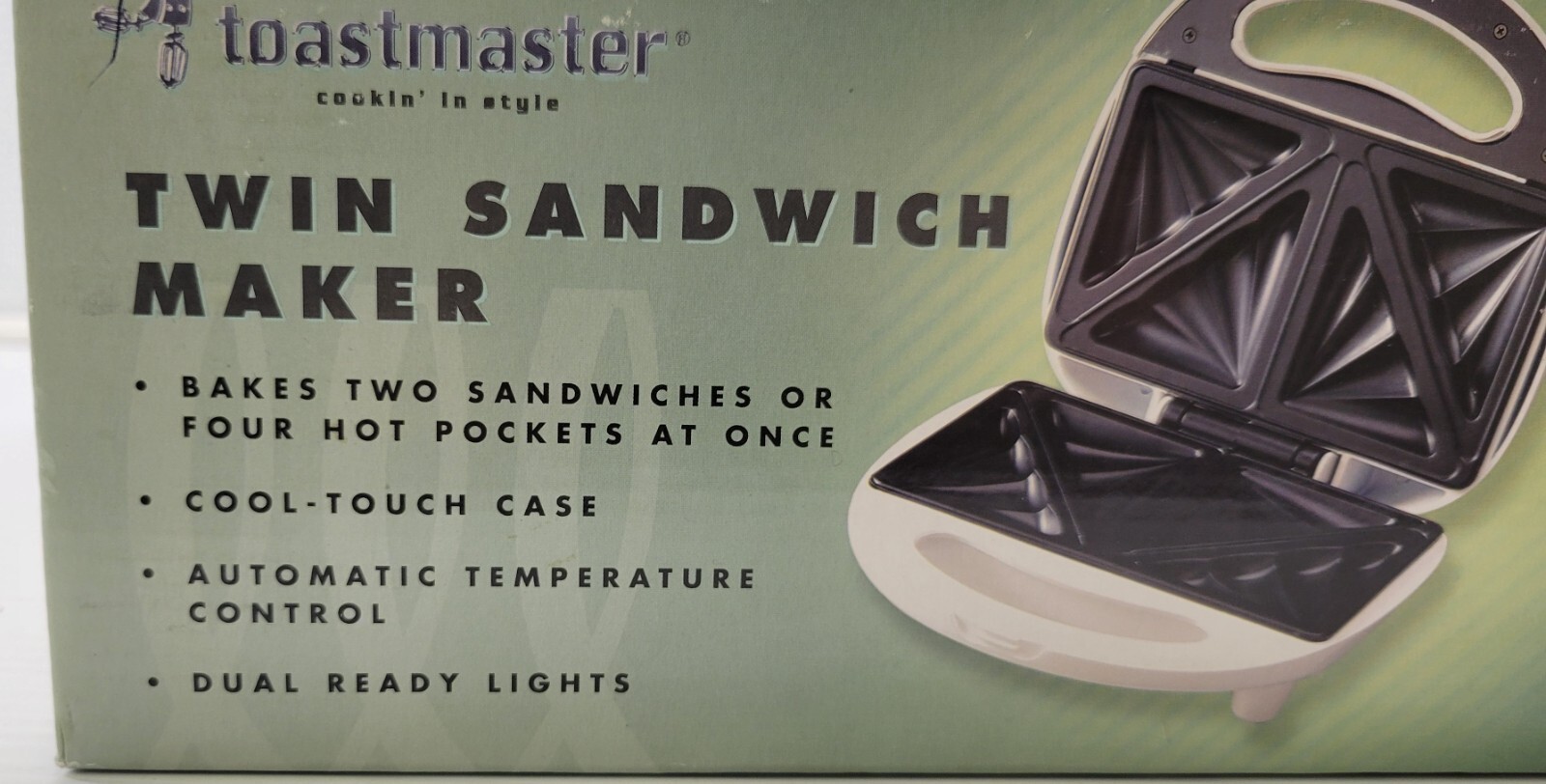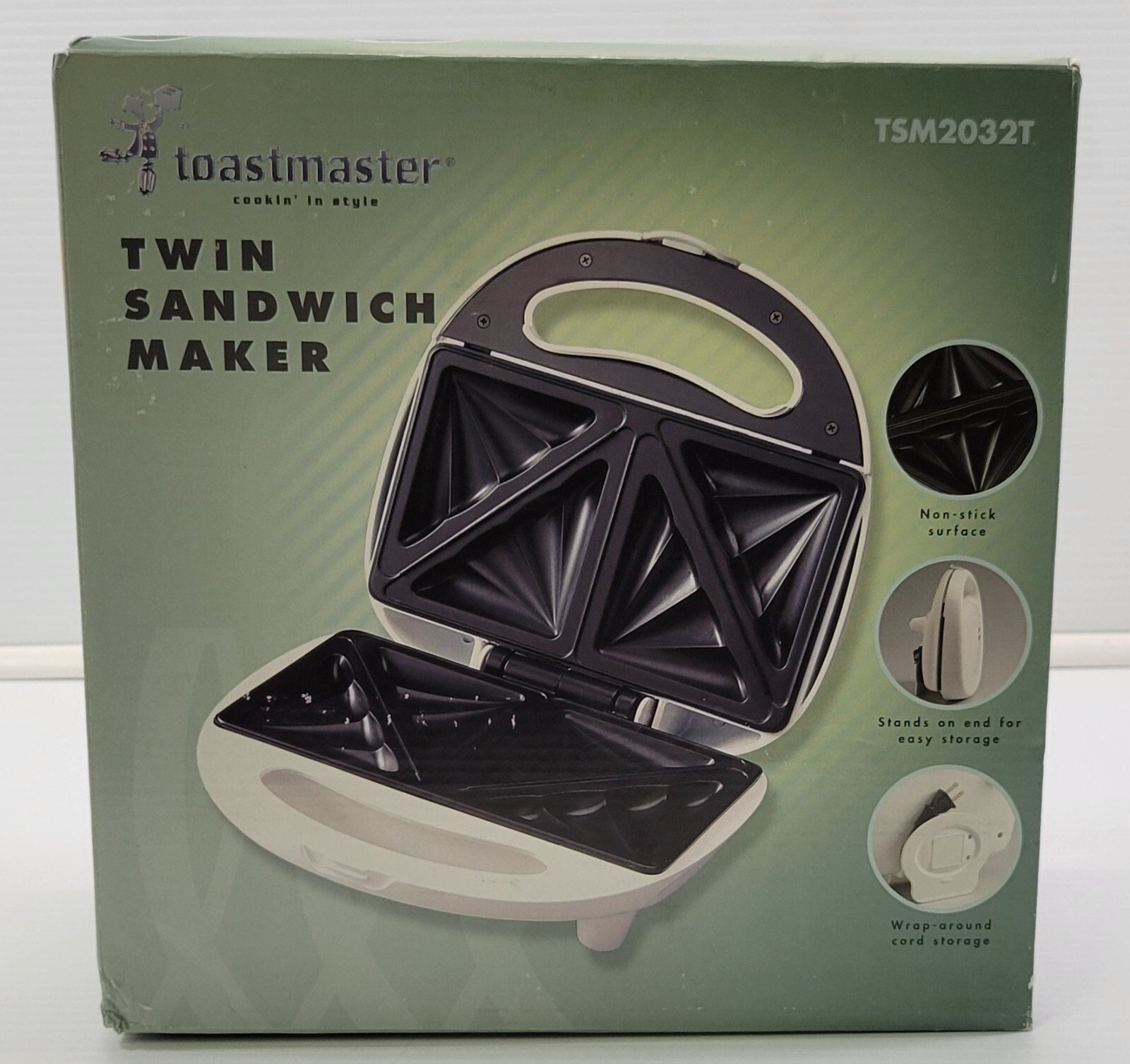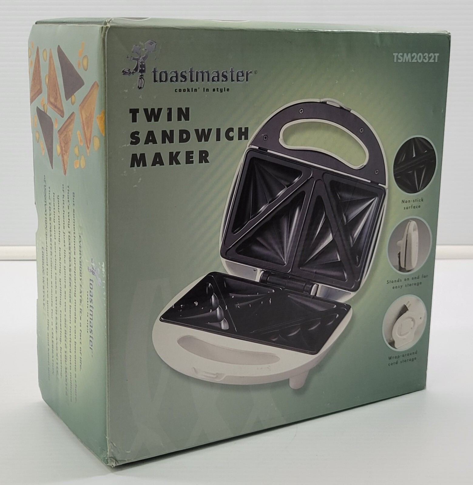 Toastmaster Twin Sandwich Maker Model TSM2032T Non-stick Based on box, grill measure roughly 9" x 9" Sandwich maker is an old un-used gift that has been in storage for some time.
