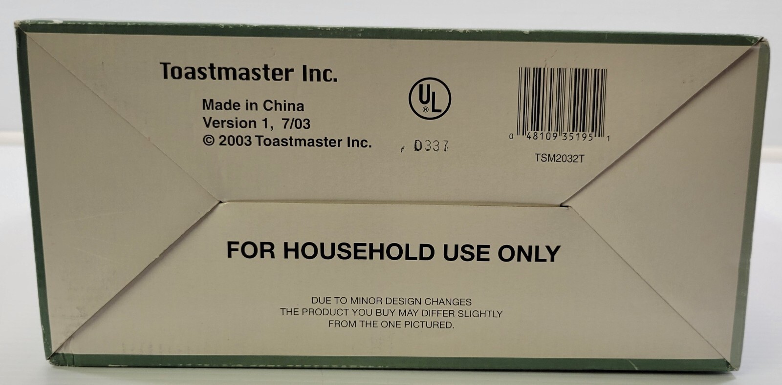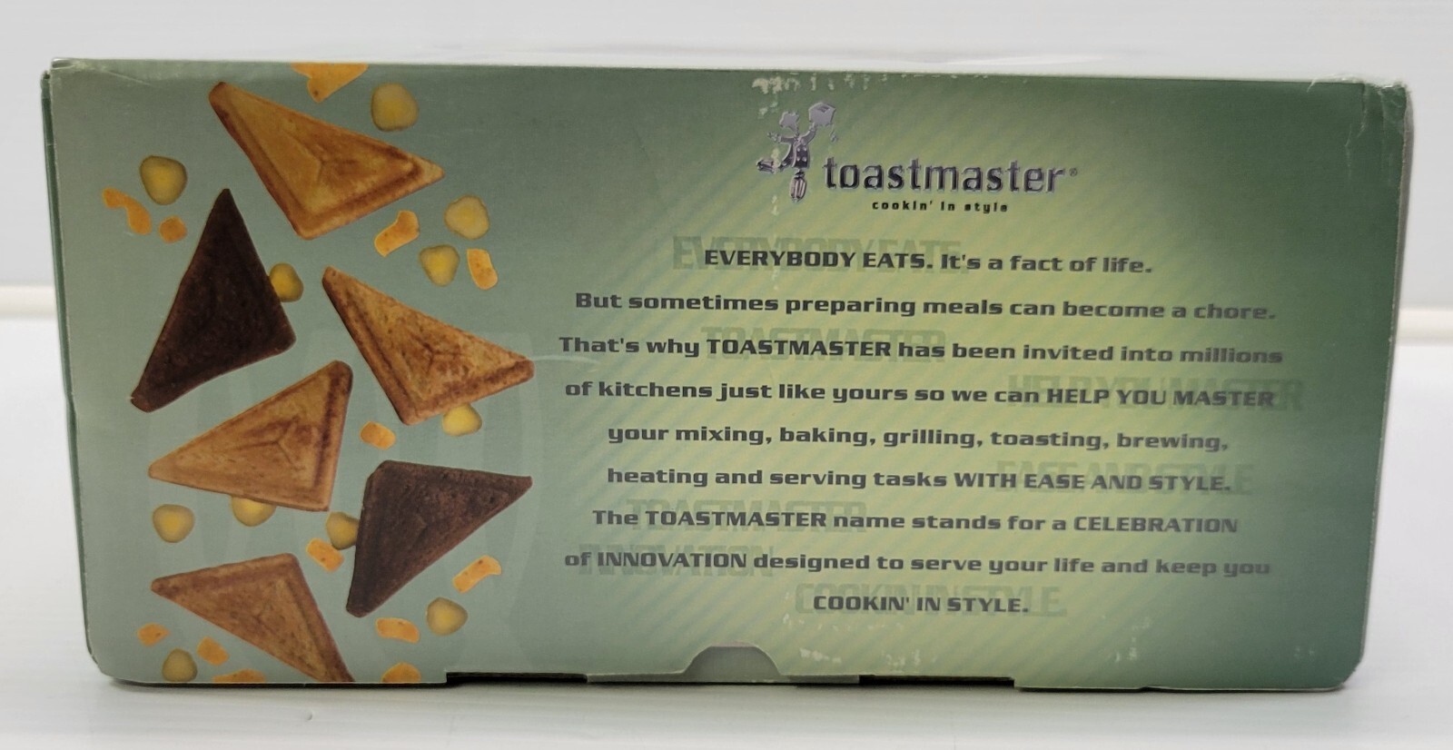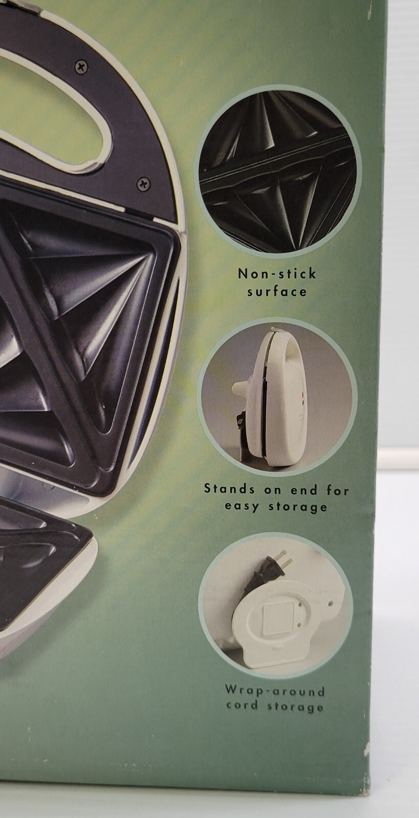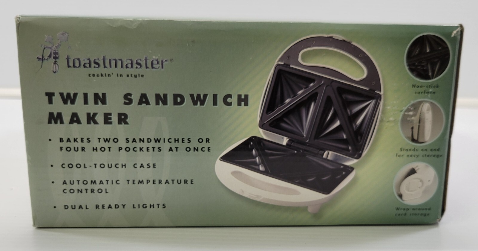 Toastmaster Twin Sandwich Maker Model TSM2032T Non-stick Based on box, grill measure roughly 9" x 9" Sandwich maker is an old un-used gift that has been in storage for some time.