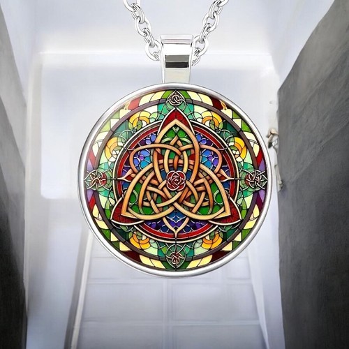 "Celebrate Celtic artistry with this breathtaking Trinity Knot pendant, featuring vibrant stained glass in a kaleidoscope of colors. The intricate knotwork symbolizes unity, eternity, and the interconnectedness of life, making it a meaningful and eye-catching accessory. Perfect for those who appreciate Celtic heritage, spiritual symbols, or unique statement jewelry."