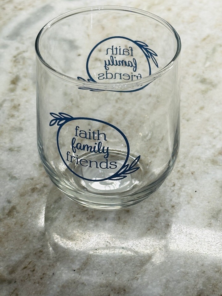 This stemless wine glass is the perfect addition to your glassware collection. The 17oz capacity makes it perfect for all occasions and the clear glass allows you to fully appreciate the color and clarity of your favorite wine. The glass features an inspirational design, with the words "Faith/Family/Friends" seamlessly wrapped around a cute bear.