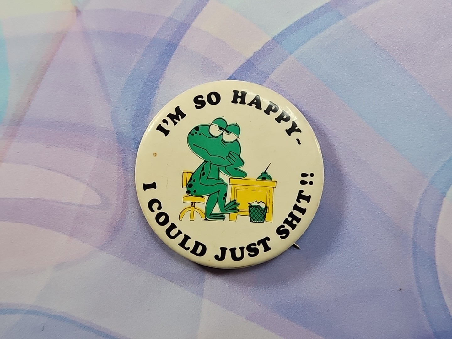 - "I'm So Happy I Could Just Sh!t" Frog Button Pin Vintage 1970s, 1.75''