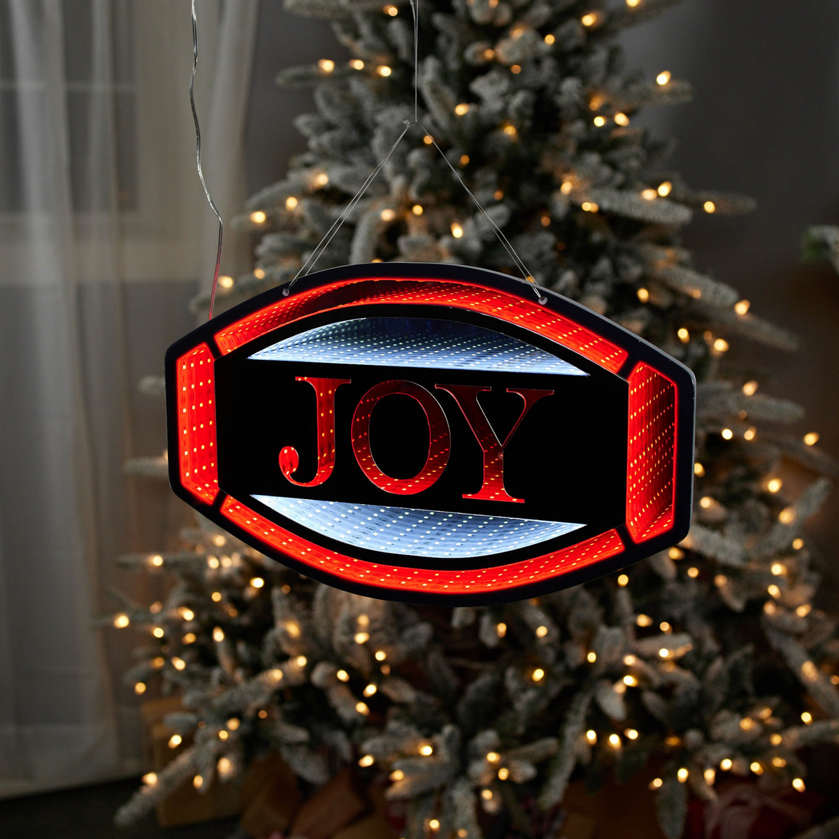 Traditional "Joy" Sentiment Embraces the spirit of the season with a timeless, cheerful message. Infinity Light Effect Mesmerizing lighting effect that seems to go on forever, enhancing any space with magical ambiance. UL Plug Powered Provides reliable lighting throughout the holiday season. Suitable for indoor or outdoor covered use only