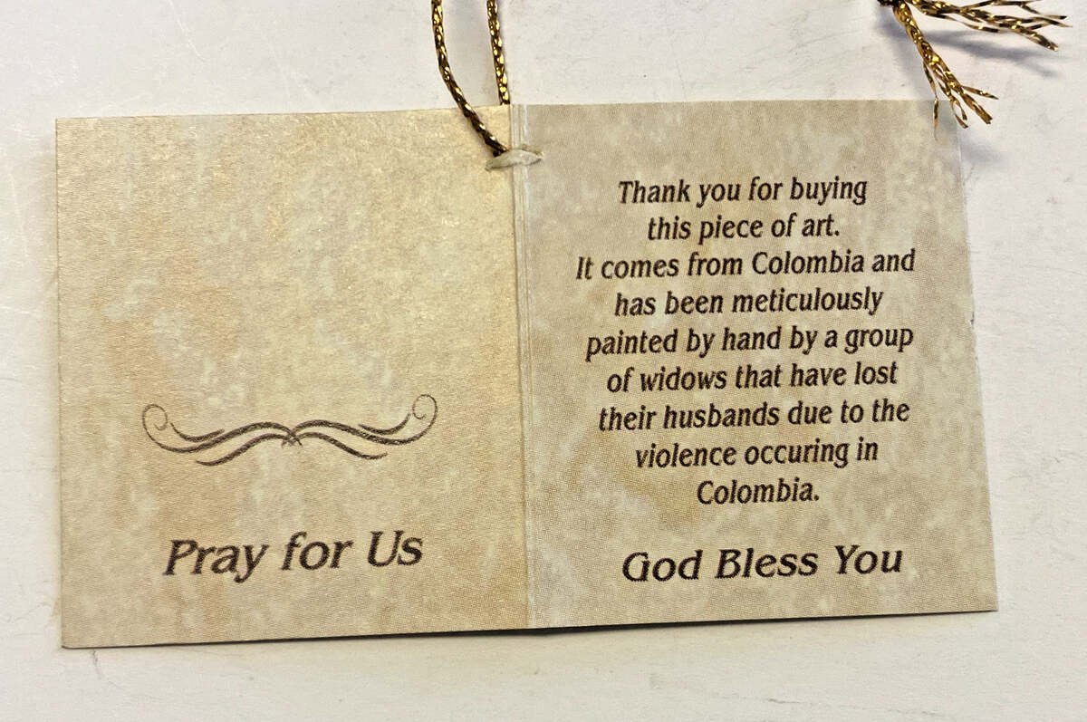 These statues were hand painted by a group of widows that have lost their husbands due to the violence occurring in Colombia. They come from the Liscano Collection.