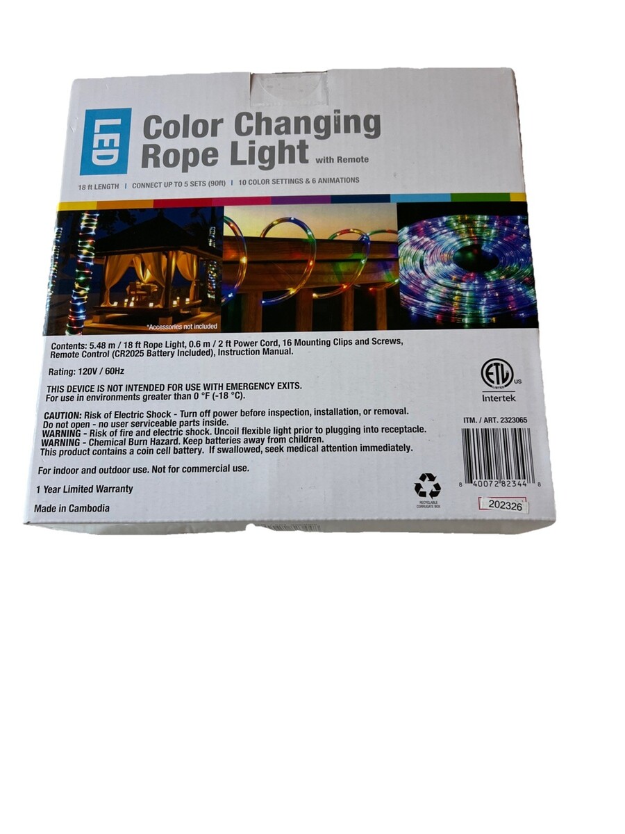 The ?NEW? LED Color Changing Rope Light is a versatile and modern lighting solution for any outdoor space. With a length of 18ft and the ability to connect up to 5 sets, this LED string light offers a variety of light colors including clear white, blue, and warm white. It features a remote control for easy customization and has a voltage of 120V, making it suitable for both indoor and outdoor use. The rope light is perfect for adding a festive touch to your entryway, bedroom, or dining room during the holiday season or for any special occasion.