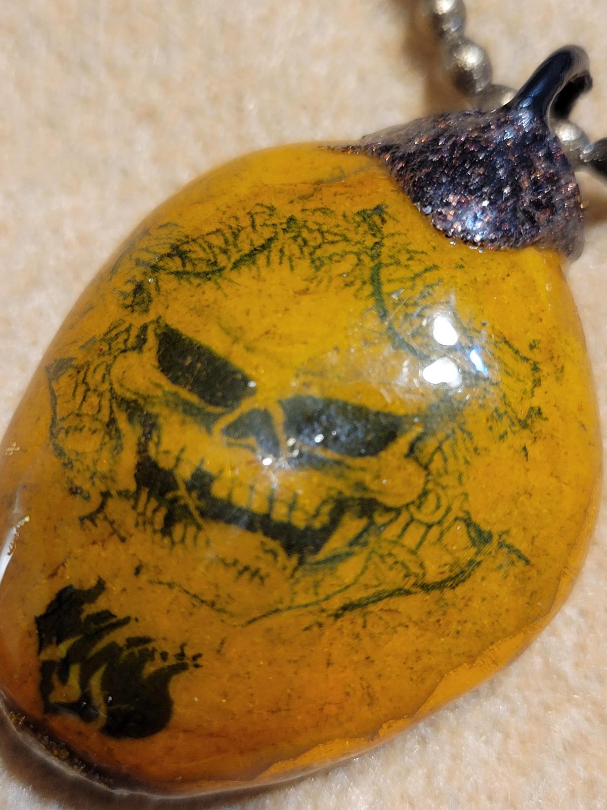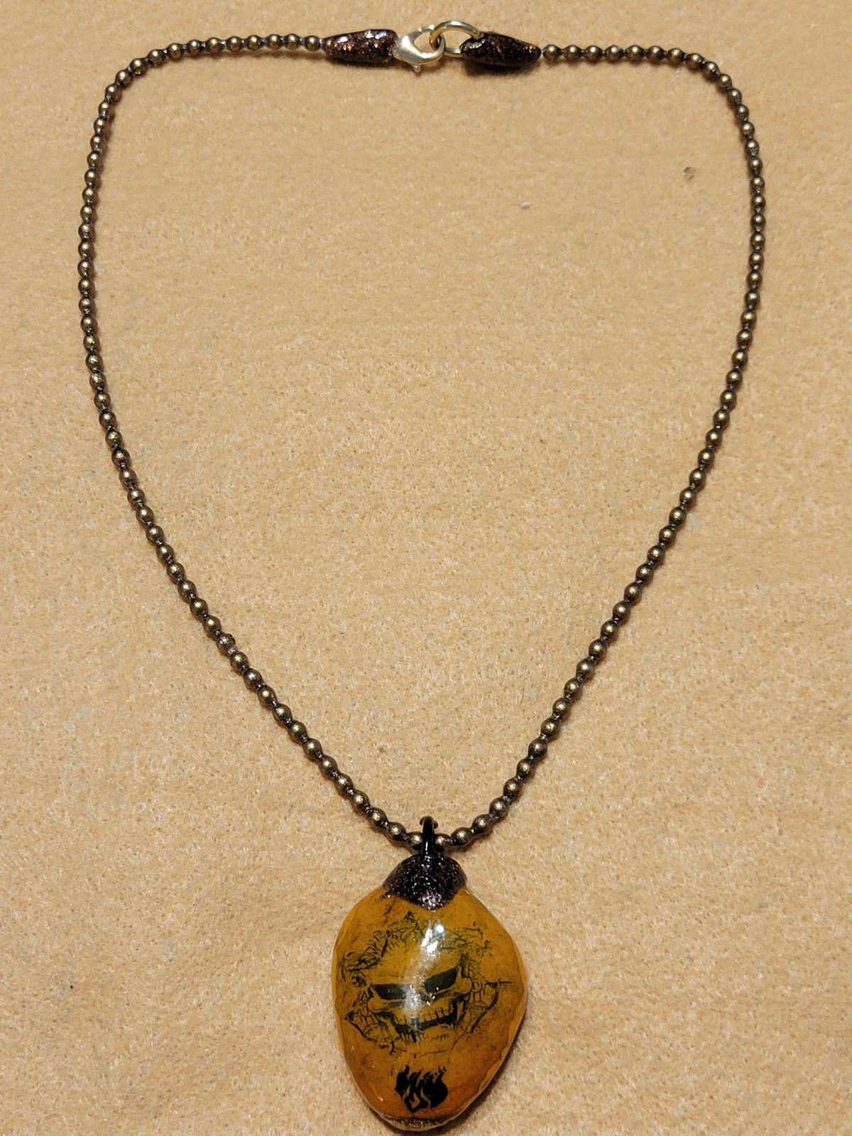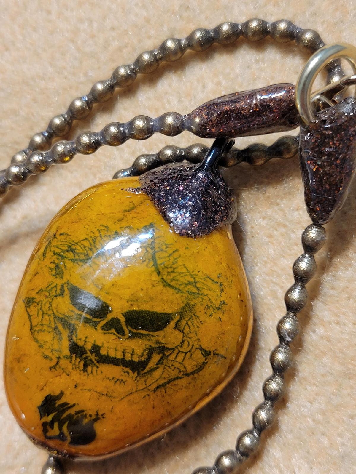 Dusted off after a couple of yrs......FRANKIE'S brings you a fine skull necklace cleverly named........this item, made in indust. bead(heavy)has been coated in brown metallic pigment enamel an coated X10 in Liquid Glass all over giving high refraction rate......sun pinpoint,will turn a few heads.......will not chip,wear,split,crack,chip,uvresist,scratchresist......its permanent,as with all work@ this studio.......ass full GALLERY@ETSY.com(154homebasepost)moving on to 1000 awsome works of art.....Also note this necklace inventory is split between "artisan" and "fashion" to receive wider traffic.......THANKS! welldressedattic.