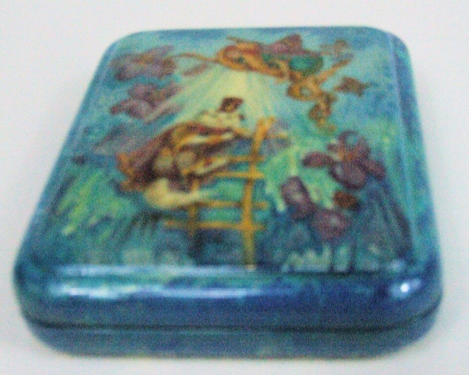 La boîte comprend un chat magique et tous ses amis, y compris une Fairy touche les fleurs alors qu'elle grimpe sur une vigne pour les rencontrer. Une seconde Fairy , au revers de cette boîte en laque, soufflant du cor en grimpant sur une branche d'arbre. Faire leur touche magique et travailler autour de nombreux papillons. Ici, elle a peint avec des nuances de bleus, d'or et de violets. Attention, clients europeens et asiatiques, veuillez noter que les frais de port standard peuvent prendre de 7 a 45 jours ouvrables pour arriver