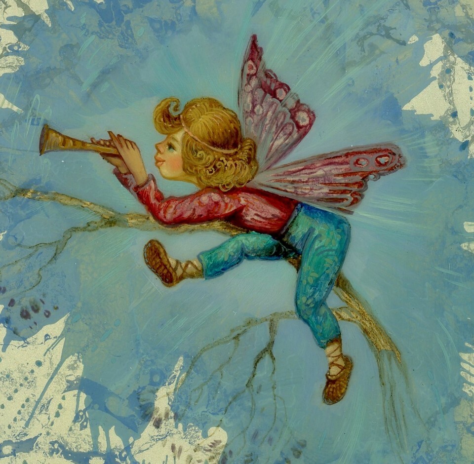La boîte comprend un chat magique et tous ses amis, y compris une Fairy touche les fleurs alors qu'elle grimpe sur une vigne pour les rencontrer. Une seconde Fairy , au revers de cette boîte en laque, soufflant du cor en grimpant sur une branche d'arbre. Faire leur touche magique et travailler autour de nombreux papillons. Ici, elle a peint avec des nuances de bleus, d'or et de violets.