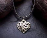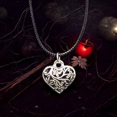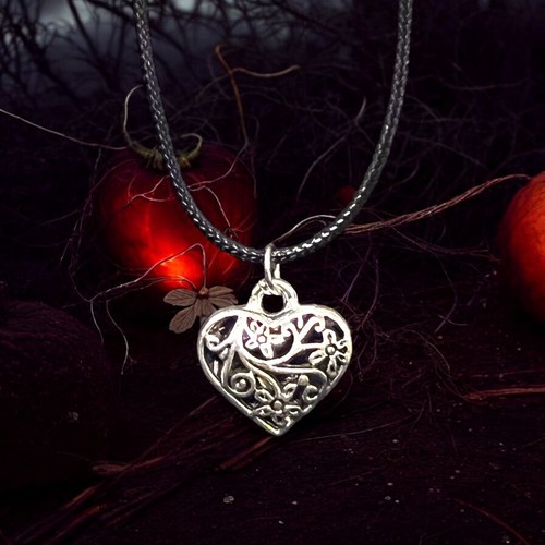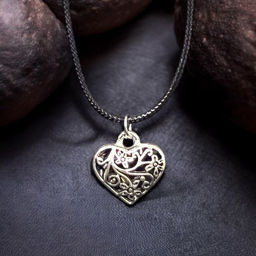 "Charming heart-shaped pendant adorned with intricate floral engravings, exuding vintage elegance and timeless beauty. Made from high-quality silver and paired with a durable black cord, this necklace is perfect for romantic occasions, everyday wear, or as a heartfelt gift for someone special. A delicate piece that adds a touch of grace to any outfit."