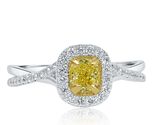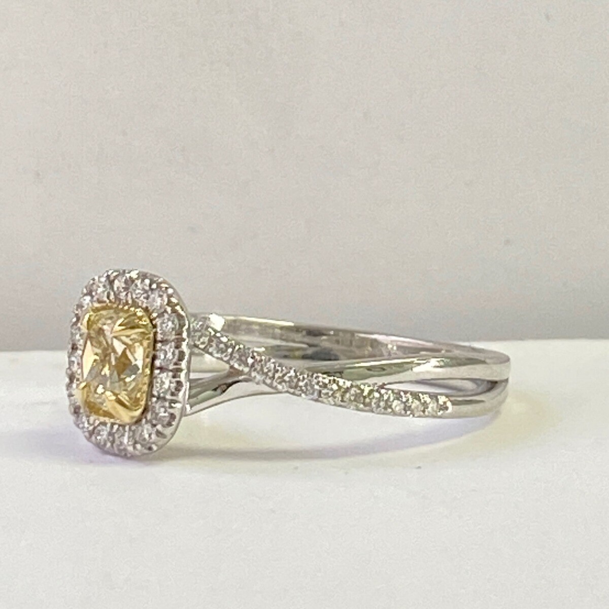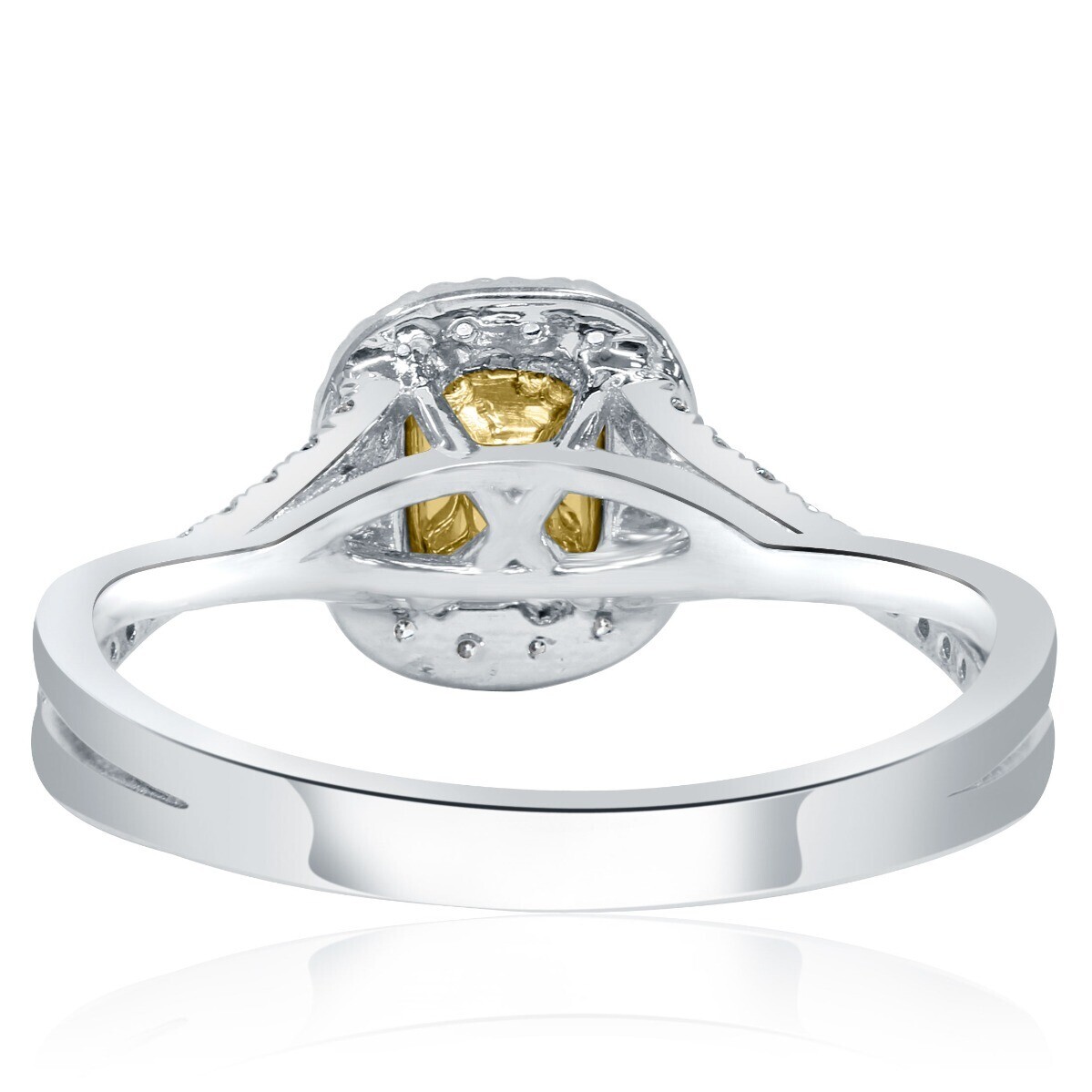 El deslumbrante anillo de compromiso de diamantes presenta un diamante natural de color amarillo claro de colchon de 0.43 quilates en una configuracion de halo de micro pavimento. Los diamantes de 0.23 ct de corte redondo adicional se alinean el vastago dividido torcido infinito que agrega una belleza adicional al anillo. Hecho a mano en oro múltiple de 14 quilates. El peso total de quilates es de 0,65 quilates.