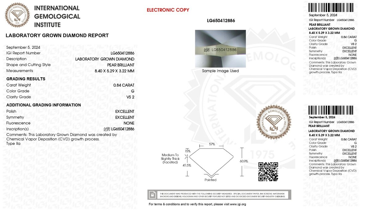 ? Please note that we will ship you same stone or exact similar stone with same color, clarity same carat weight certified stone. All Our Diamonds Are Certified And Laser inscripted.all of our diamonds are tested and certified with labs like IGI, GIA ,Etc.LabIGIReport #-ShapePearCarat1.00ColorGClarityVS2Cut-PolishExcellentSymExcellentFluorNoneLocationNew York, United StatesDepth62.2%Table61%GirdleMED-STKCrown13.5%, 33.6Pavillion46.0%, 41.6Culet-Meas8.99 x 5.63 x 3.50Ratio1.60BGMNoneGrowth TypeCVDPlease note that we are listing all of our stone's color clarity grade as per IGI Lab Report. IGI Lab is the 2nd most reputable trustworthy Lab after GIA. Every person can have a different opinion about the color clarity of the stone. So the stones you are getting can be one or two grades lower in color clarity grade as per GIA standards but as IGI standards those are as mentioned in the listing. So the stones you are getting can be g to i in color vs2 to si2 in clarity grades as per GIA standards but as IGI standards those are as mentioned in the listing. how practical it is to use $75000 (3 Carat E VS!) Natural Diamond stone standard for the same color clarity grade (3 Carat EVS1) Lab Grown Stone which you are getting for $750. My advice to you is whatever authenticity says please please get the stone if you do not like then I will accept the return without any question in the next 30 days of purchase. I don't want you to miss the great opportunity to buy those beautiful lab grown stones which are 100% the same chemical other properties wise as natural Diamonds at 1% of price compared to Natural Diamond.