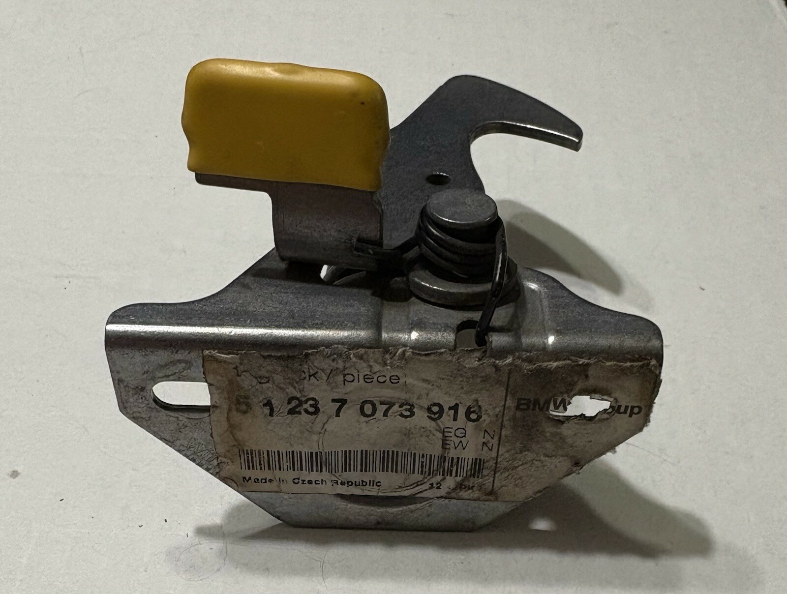 OEM BMW hood latch / catch lock mechanism with integrated spring and yellow release tab. Removed from a 2009 BMW 328i sedan (E90). Tested and functions smoothly.