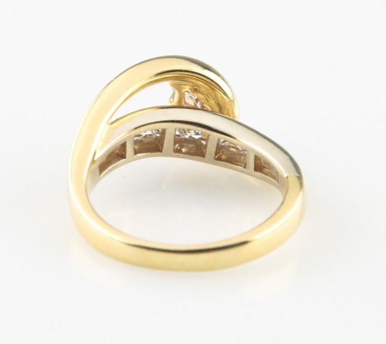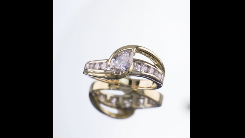 Features a Pear Shape Diamond Set Within a Yellow Gold Ribbon Floating Above a Gallery of Round Diamonds, Supported by a 2.5 mm Wide Band