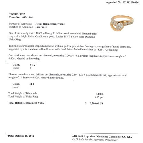1.00 carat Pear Shape Diamond 18k Yellow Gold Engagement Ring Size 6.25
