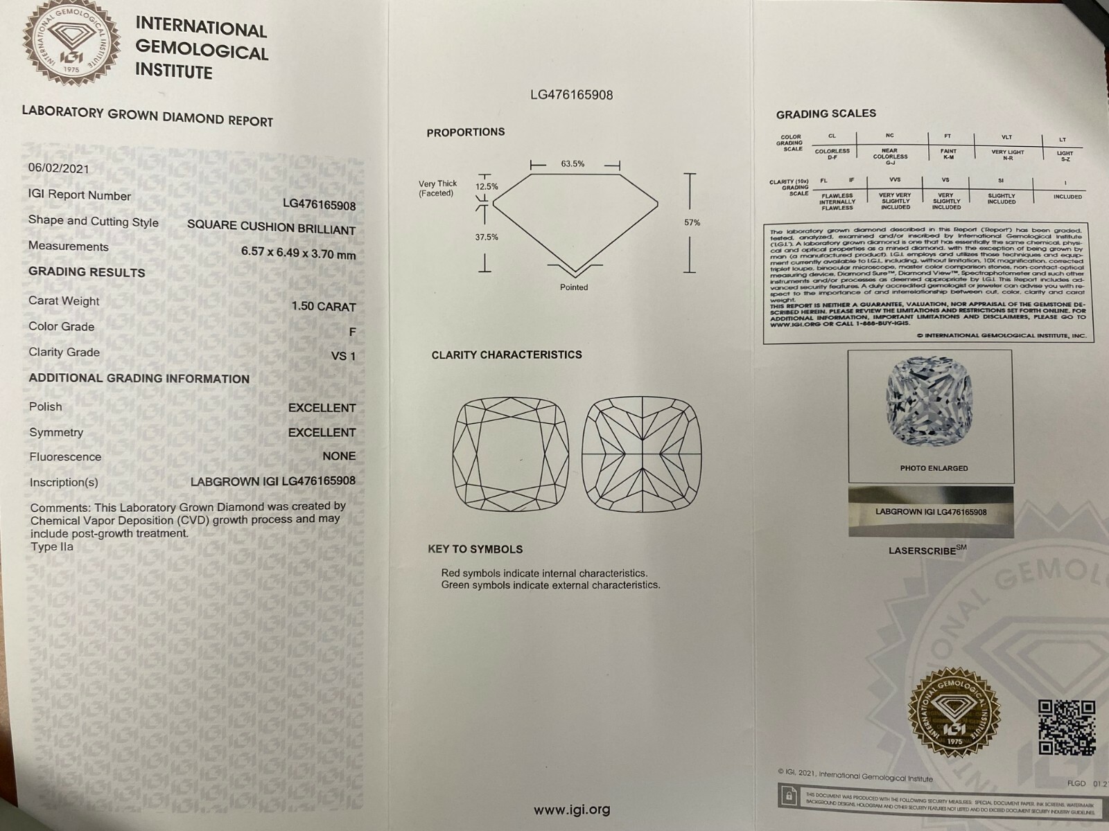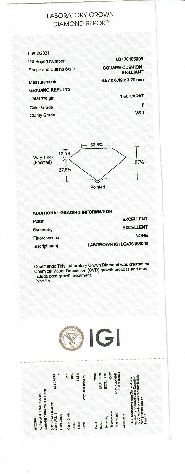 - 1.50 CT CVD Lab Grown Cut Cushion Diamond F VS1 Igi Certified- show original ...