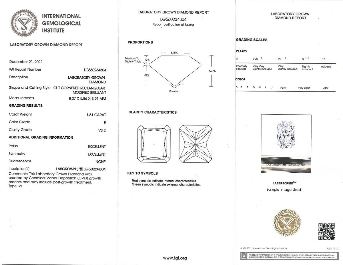 This radiant cut IGI certified 1.61 carat lab grown diamond offer a beautiful and environmentally friendly alternative to traditional mined diamonds, while still retaining the same quality and beauty that diamond enthusiasts have come to expect surrounded by round brilliant cut earth mined diamonds. The total carat weight is 2.33 carats.