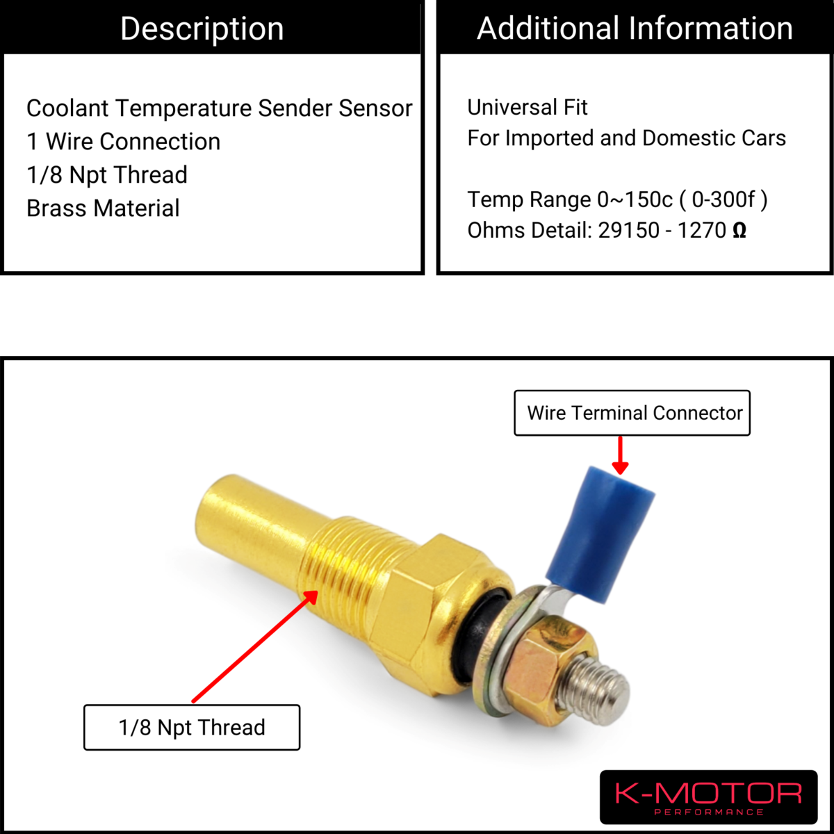 1/8 NPT Temperature Sender Sensor - For Coolant Oil Water Gauge | K-MOTOR