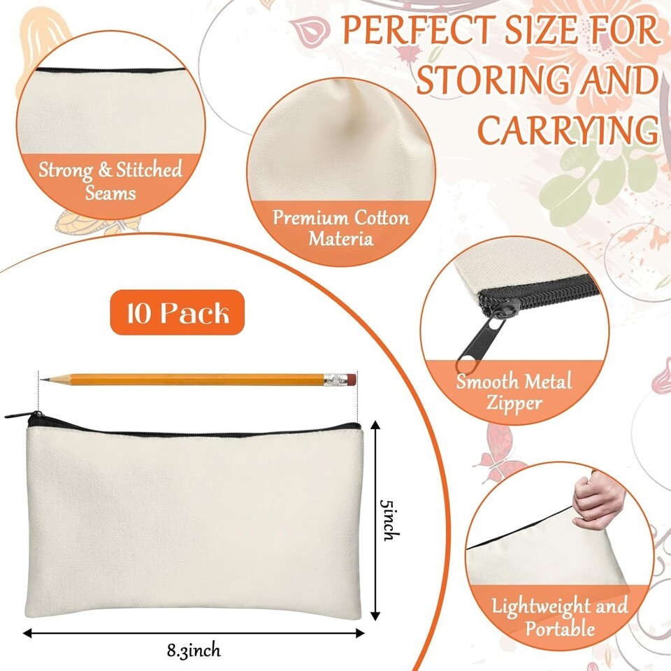 10 Blank Canvas Zip Bags - Perfect for DIY Crafts, Travel, and Cosmetic Storage
