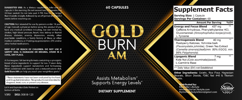 10 Pack Gold Burn AM, assists metabolism and support energy-60 Capsules x10