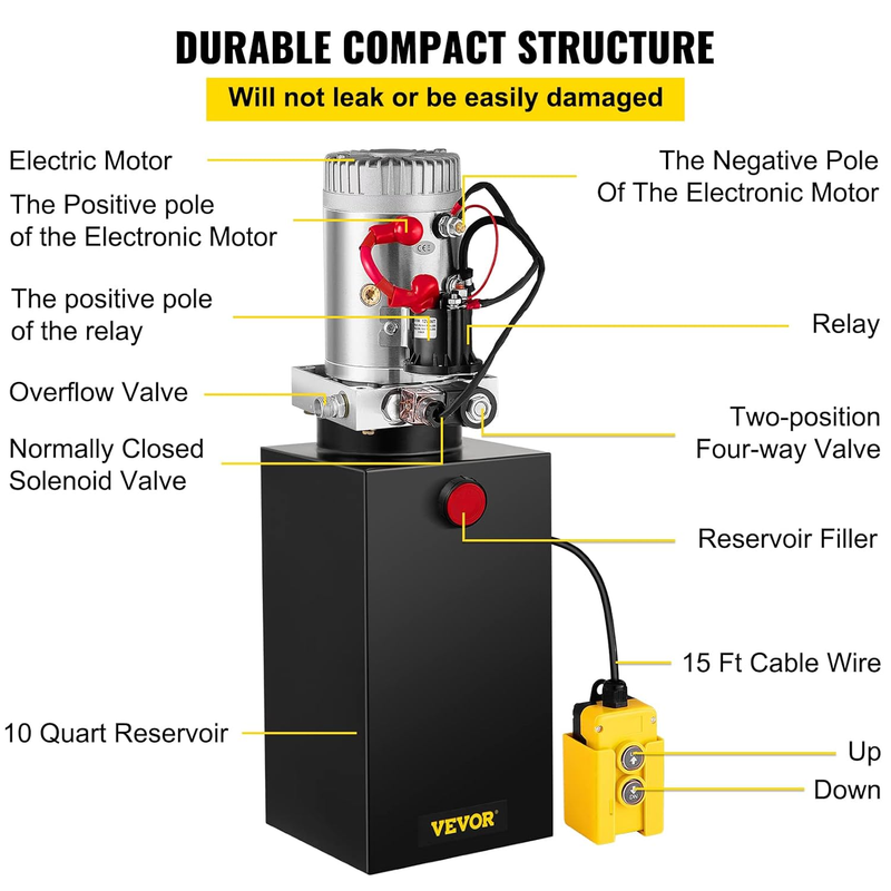 This hydraulic pump is a single-acting power unit for power up and gravity down. It has a 10-quart sturdy metal reservoir and is designed with a 12V DC motor that can provide strong power for hydraulic systems like dump trailers, forklifts, lifting platforms, etc.