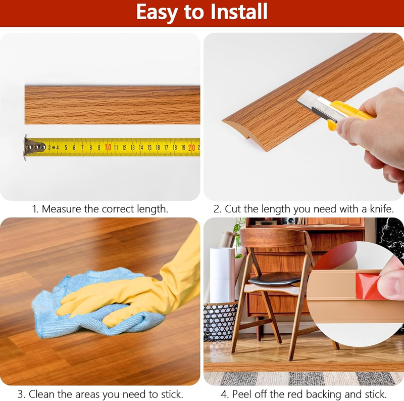 ?Easy to Use?The rubber carpet transition strip is self-adhesive, with a practical peel and stick function, no need to punch holes, no damage to the floor. Just measure and cut the desired length, peel off the red backing and stick to a smooth surface. In winter, you can blow it with a hot hair dryer. Use something to press both ends for a few hours. Make transition strip stickier.