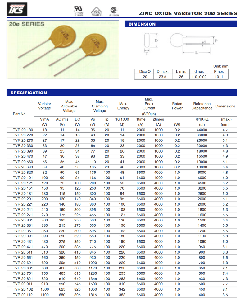 10 Pieces - TVR20471KSY TKS 20mm Zinc Oxide Varistor ZOV 470V 6.5kA 220J 300VAC 385VDC Radial