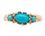 Victorian 10k rose gold turquoise ring. There are three small genuine turquoise cabochons. The oval measures about 6mm x 4mm, and there are two rounds measuring about 2mm. The ring fits a size 7.25 finger, weighs .72 dwt., and dates from the 1890s. Terrific!