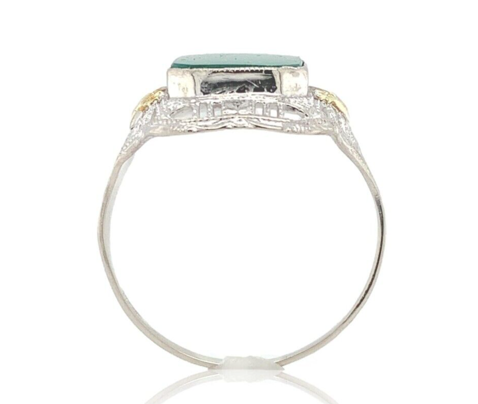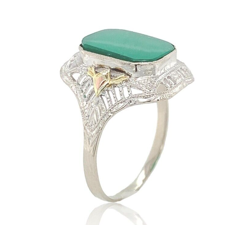 10k white gold filigree ring featuring a green onyx center that is accented on two sides with a small green and rose gold applied design. The onyx measures about 10mm x 8mm. The ring fits a size 6.25 and weighs 1.11 dwt. It dates from the 1920-30s. Terrific!