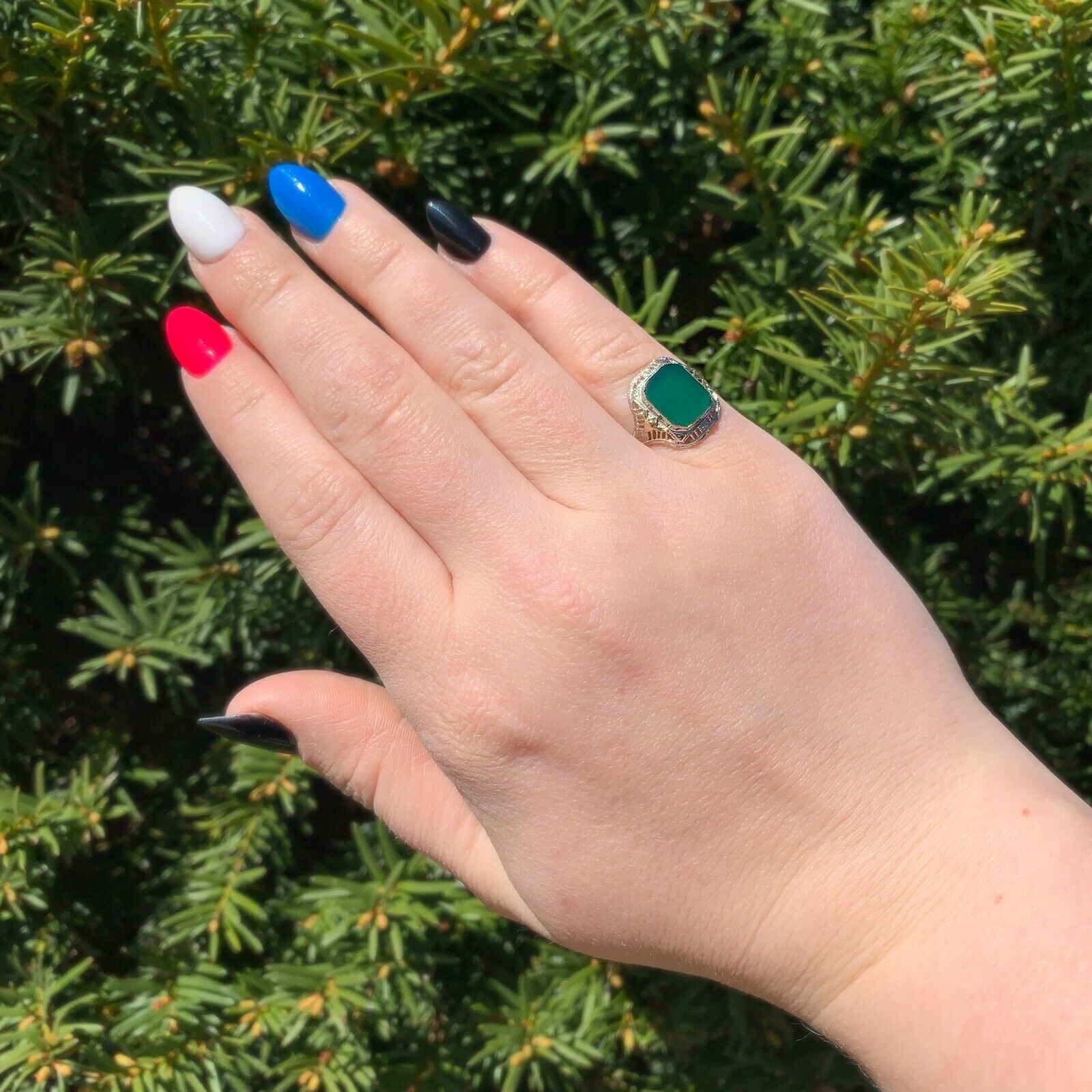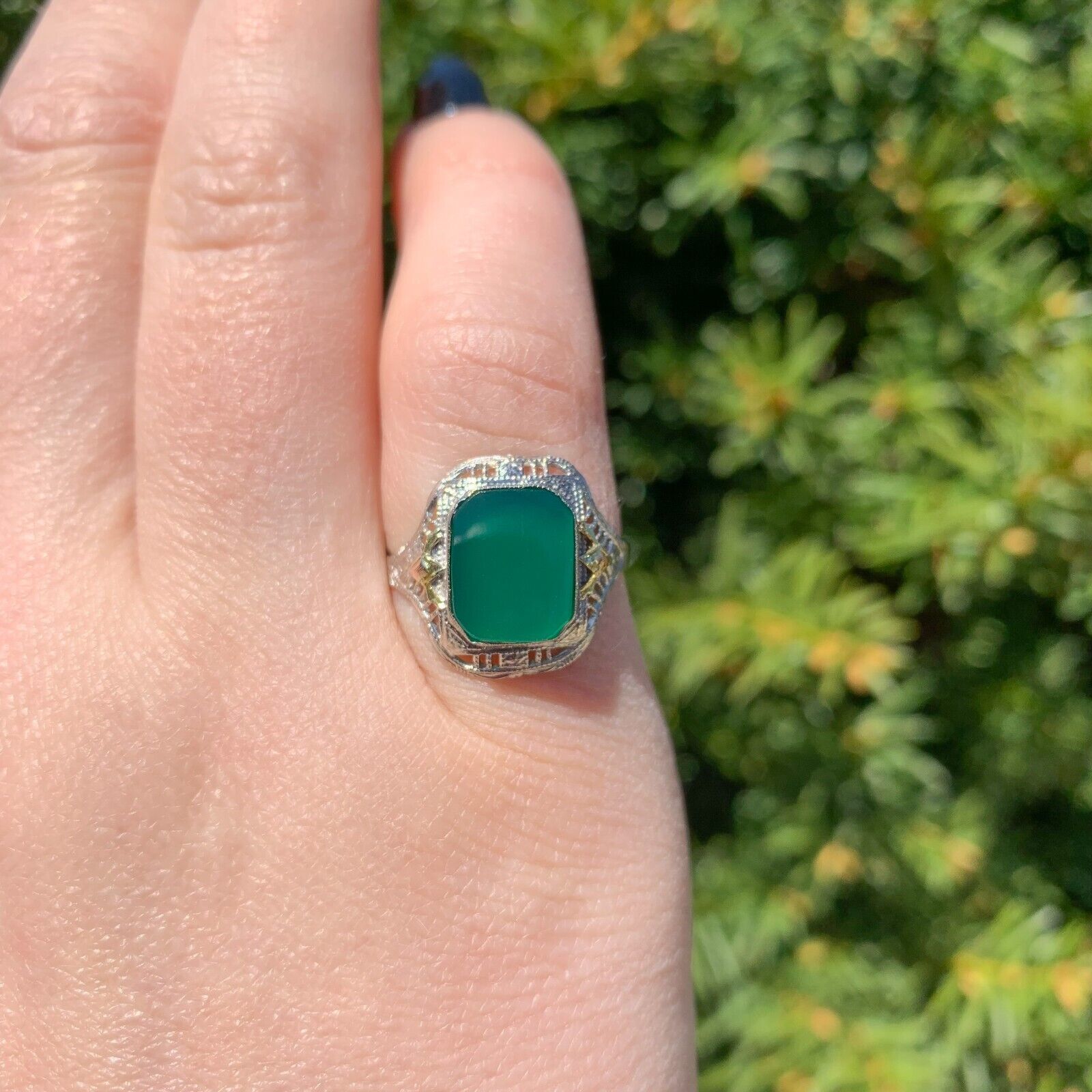 - 10k White Gold Filigree Ring with Genuine Natural Green Onyx w/ Accents (#J6598)