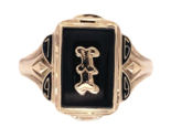 10k yellow gold Josten's class ring with black onyx and applied 10k yellow gold initial "I". The ring has "19" on the left and "69" on the right with black enamel. Engraved on the inside "PAP". Looks unworn, new old stock. The ring fits a size 8.5 finger and weighs 2.44 dwt. It is dated 1969. Terrific!