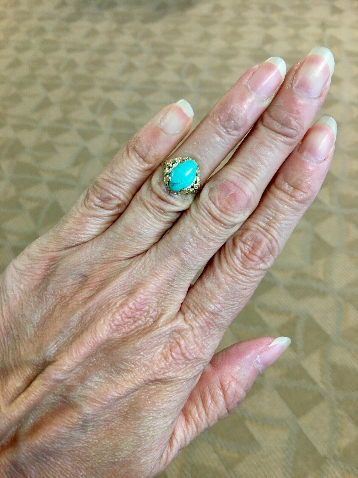 - 10k Yellow Gold Vintage Genuine Natural Turquoise Ring Applied Flowers (#J5213)