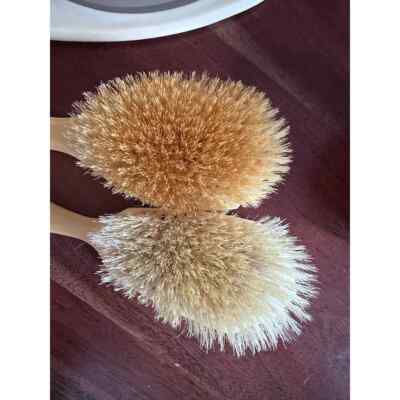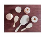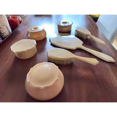 Includes 2 brushes, 1 large hand mirror which is in great condition, and 4 large 2 pc covered dresser dishes-2 hair collectors and 2 dresser dishes. All in very good condition- the mirror does have light scratching on the non-reflective side.. No cracks or chips. The mirror is 14.5" long for context.The brushes are boar bristle.LOVE RETRO!