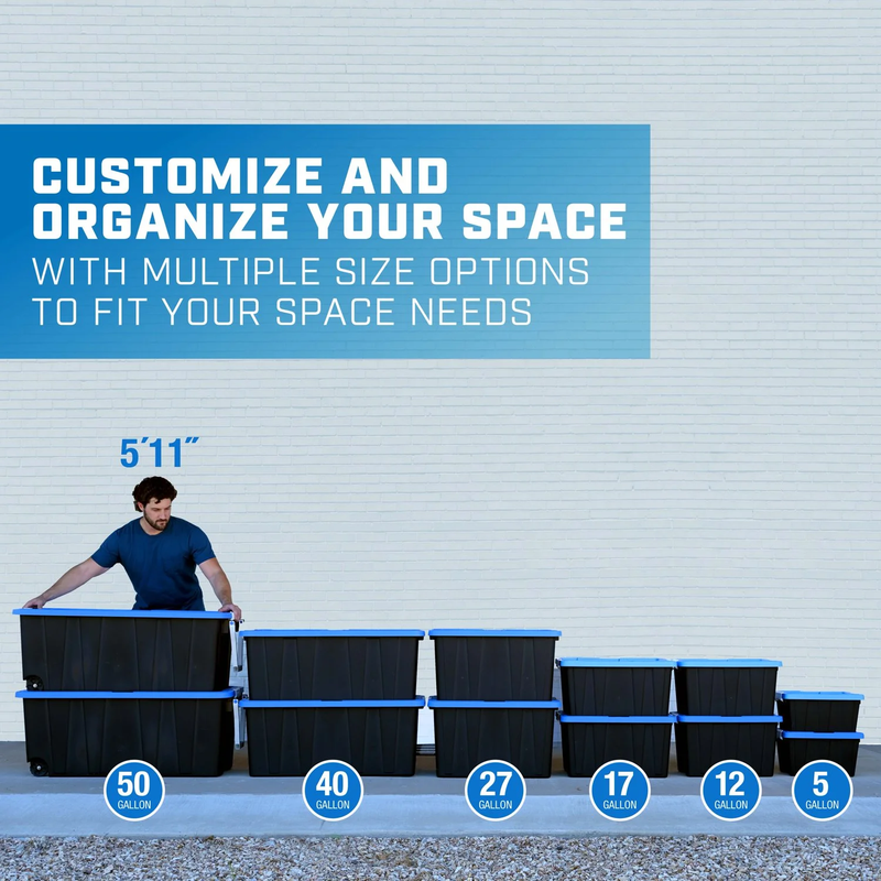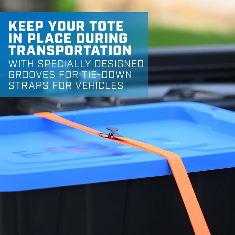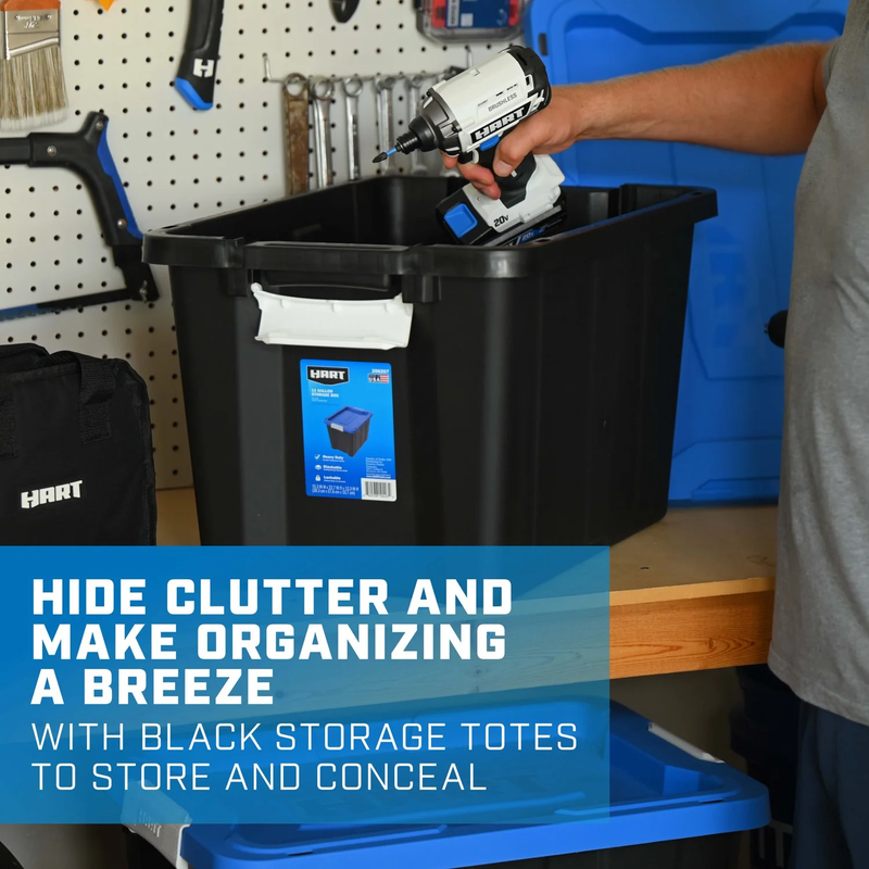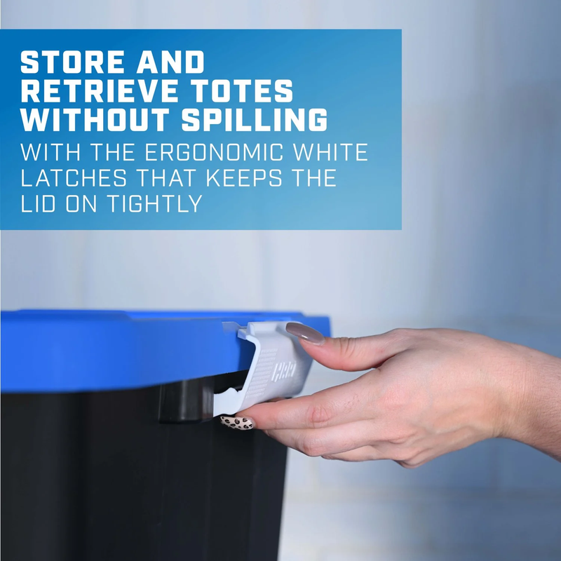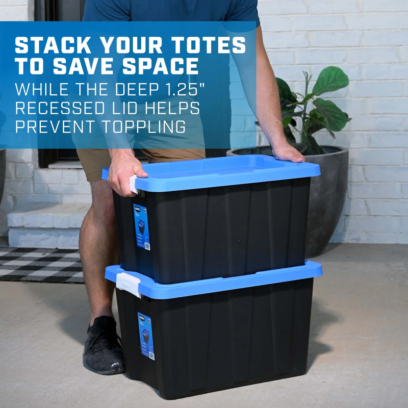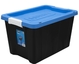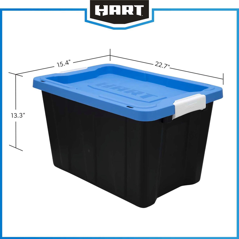 Durable and Heavy-Duty black resin construction resists rust, dents, stains and peeling to ensure lasting use while protecting against pest, dust, pollen, and weather Stackable and Recessed lid design creates stability and reduce toppling when multiple units are stacked Latching Handles and Easy to open and close 2-point grip latch handles keep your items safes from spilling or falling out Lockable Lid: Lid comes with 4 holes ideal for zip-ties or large enough for padlocks to keep your items safe and secure Exterior Dimensions - 15.3 IN W x 22.7 IN D x 13.3 IN H OR (39.3 cm x 57.6 cm x 33.7 cm) Easy to clean surface, Indoor or Outdoor use Sustainable - Made from recycled materials Set of 1: Includes 1 black base and 1 blue lid Storage Ideas: Gardening supplies, Pet treats and supplies, Cleaning and household products, Holiday and seasonal items, Linens, Clothing, Shoes, Handbags, Toys, Games, Arts and Crafting supplies, Kitchen items that are easily breakable, Underneath cabinets, In smaller or hard to reach space like attics, basement, and pantries Collection: HART Heavy-Duty Latching Black and Blue Storage Totes comes in additional sizes such as 5 Gallon, 12 Gallon, 17 Gallon, 27 Gallon, 40 Gallons and 50 Gallons