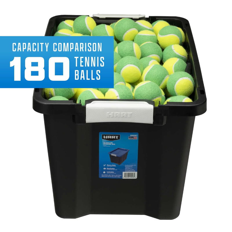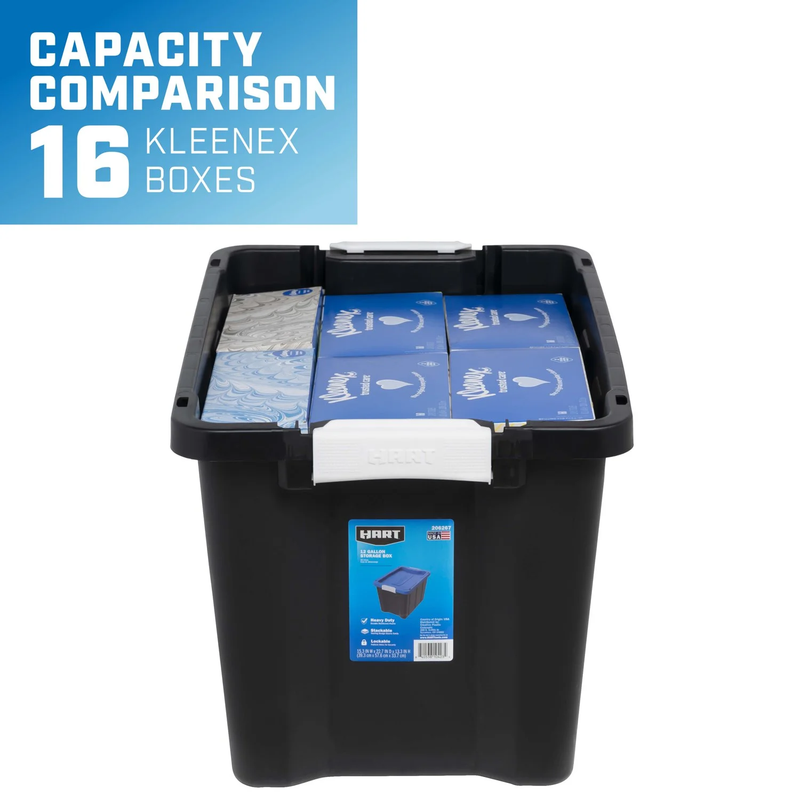 The HART 12 Gallon Heavy Duty Latching Plastic Storage Bin Container, Black base/Blue Lid, Set of 1 provides you with an easy storage and organization solution to reduce clutter and increase space in your home. Made of extremely durable plastic (polypropylene), the fluted rigid walls of these storage bins are designed to be strong and stackable to maximize storage space and to stay stable when stacked. The recessed lid design helps keep these storage containers secure and prevent tipping. The two tough latching white grip handles make it easy to transport or use for moving valuable around while keeping items secure. The compact 12-gallon size is great when needing to store heavier items or on higher shelfs. For added measure, the storage tote includes 4 large holes around the edge to keep items safe using zip-ties or padlocks. A perfect storage solution to help organize items for adults or kids. Build your perfect storage organization system with other sizes that are available, such as, 50 Gallon Latching Tote, 40 Gallon Latching Tote, 17 Gallon Latching Tote, 12 Gallon Latching Tote, 5 Gallon Latching Tote, and combine it with our plastic storage shelves, available in 4-tiers or 5-tiers in a variety of widths and depths.