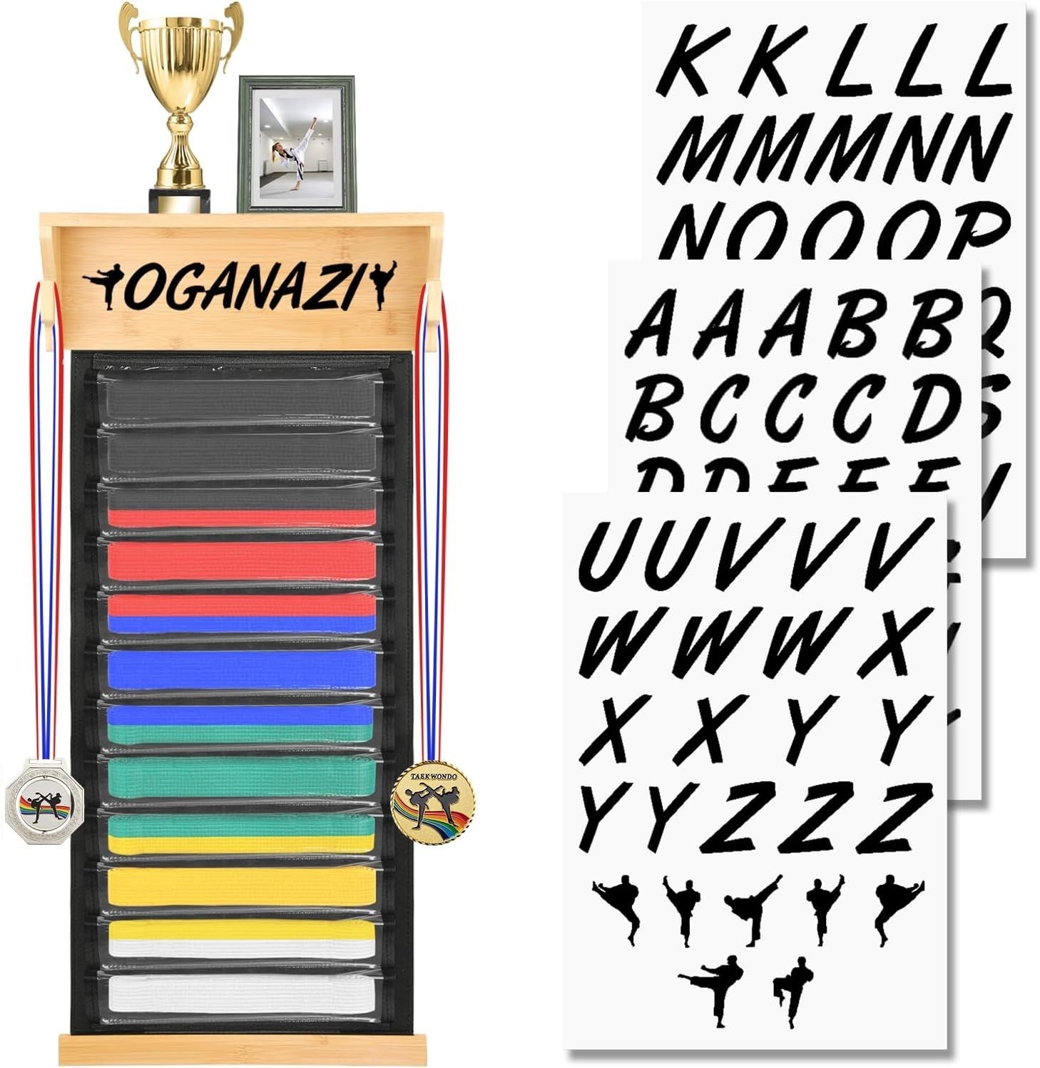 3-in-1 Display Rack: The martial arts belts display holder features 3 in 1 multi-purpose that can not only for storing and displaying 12 taekwondo belts, but also for hanging various medals at both ends of the top slat. The top is specially designed with a displaying area, allowing you to place your award cup or keep a photo album of exciting moments, showcasing your glory and achievements.