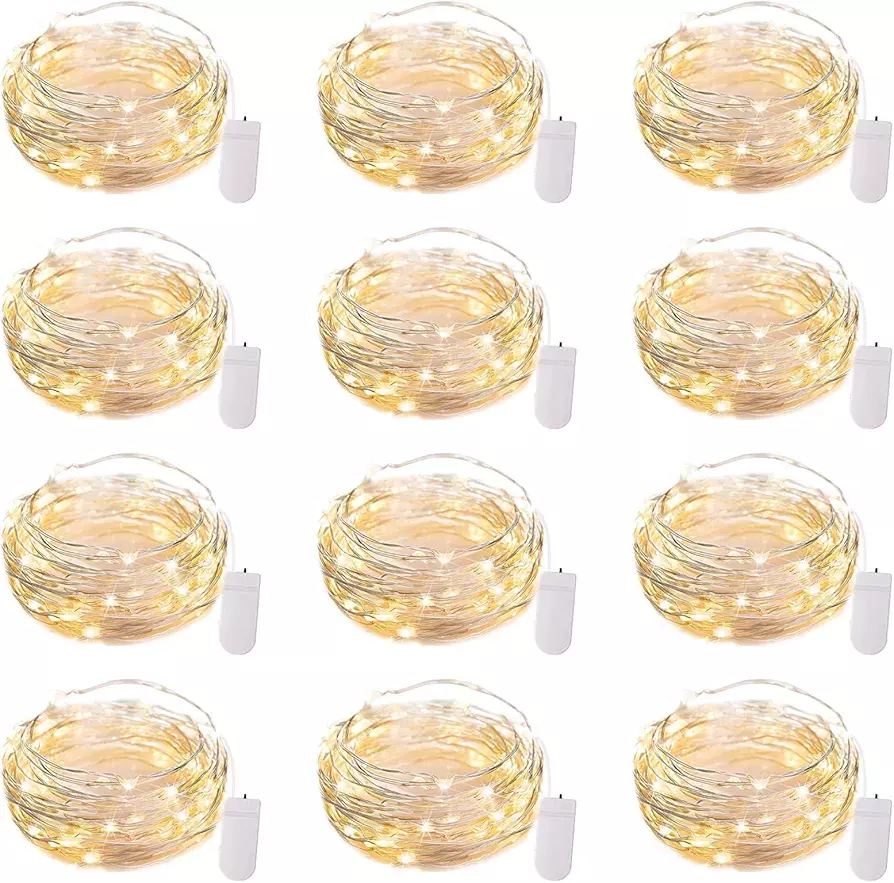 ? 12 Pack Battery Operated LED Fairy Lights ?- Powered by 2 CR2032 batteries (included), the 7 feet micro fairy light with 20 upgraded energy-efficient LEDs is perfect for both everyday decorations as well as holiday decor. The thin copper wiring and small-sized LED bulbs will add a delicate and cozy touch to your personal space ? 7ft Flexible Silver Wire ?- The starry moon fairy lights are made of a soft bendable silver wire. Easy to bend it to any shape or wrapped it on anything you want like photos, shelves, walls, mirrors, crafts, furnitures, wreaths, trees, branches, plants, flowers, or wedding deco ? Long-Lasting Battery Life ?- Crafted with high-quality strong silver wire and energy-efficient LED bulbs lasting up to 2 years, these mini fairy lights are easy to use and safe to touch due to their low voltage. The included CR2032 watch batteries allow the lights to stay lit for more than 72 hours and can be quickly turned on or off via a simple button