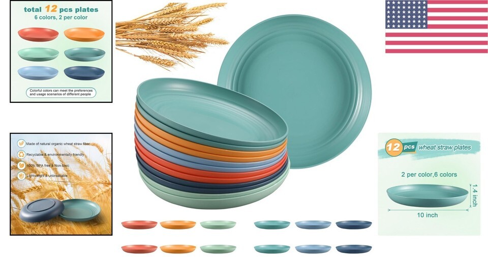 12 Pcs Unbreakable Wheat Straw Dinner Plates Set - 10 Inch in 6 Vibrant Colors