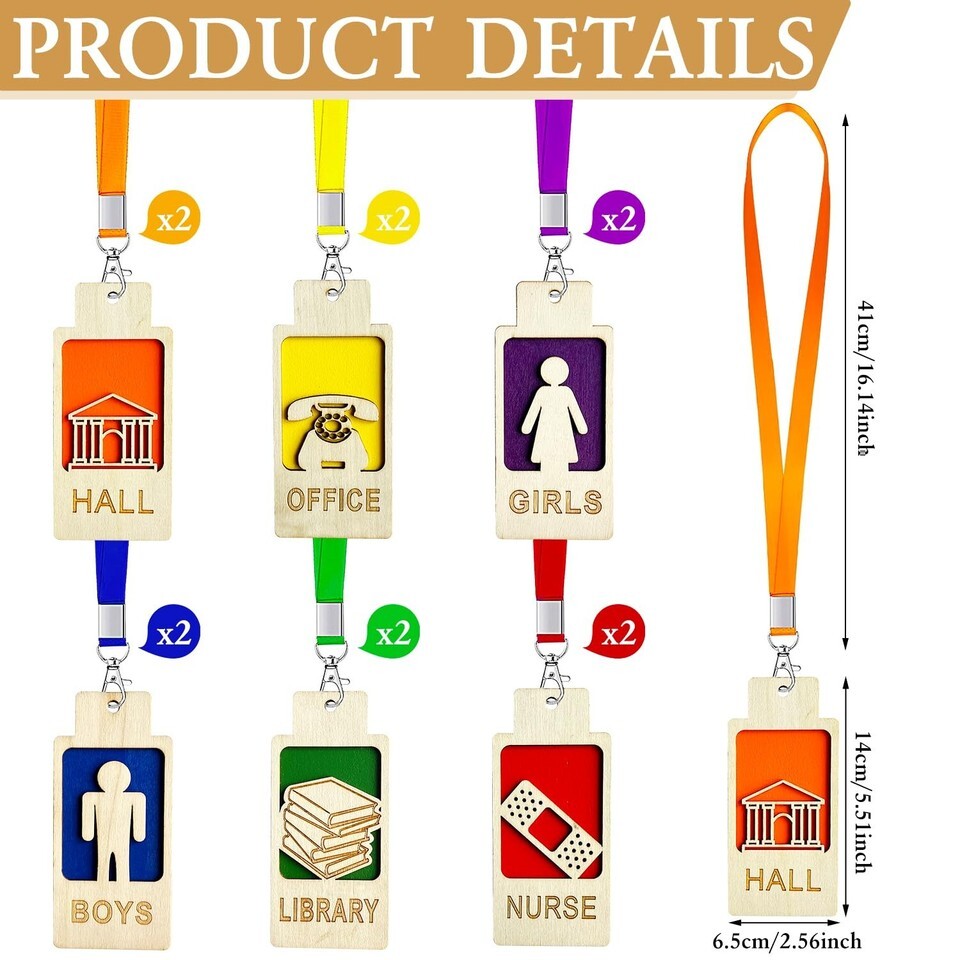 12 Sets Hall Pass Lanyards Unbreakable Wooden Bathroom Passes Classroom