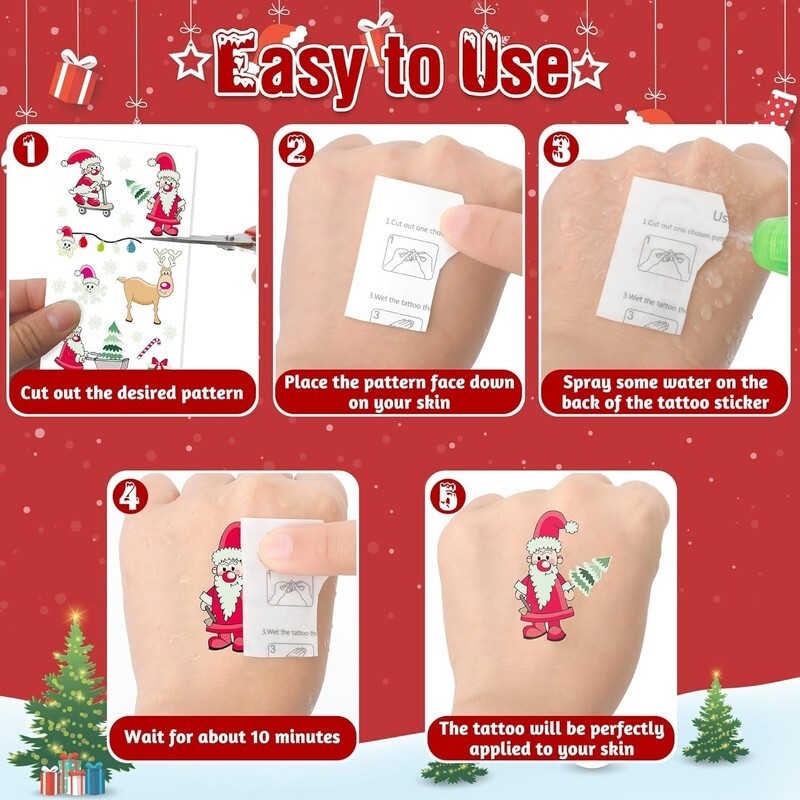 Skin-Friendly Waterproof Material: Made from safe, non-toxic PVC that's gentle on even sensitive skin, these Christmas temporary tattoos kids can wear are waterproof and odor-free, ensuring comfortable throughout holiday celebrations.