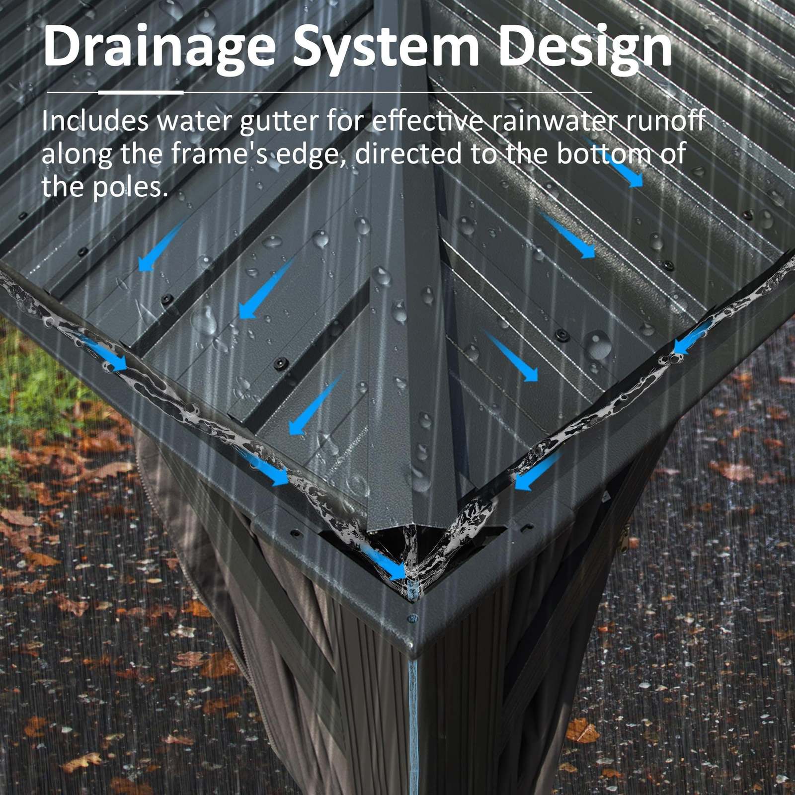 [Built-in Drainage System for a Dry, Comfortable Space] The metal gazebo features an innovative built-in drainage system that channels rainwater away, keeping your space dry and comfortable, even during rainy days. No more interruptions from rainfall?enjoy uninterrupted outdoor relaxation and entertainment all year long.