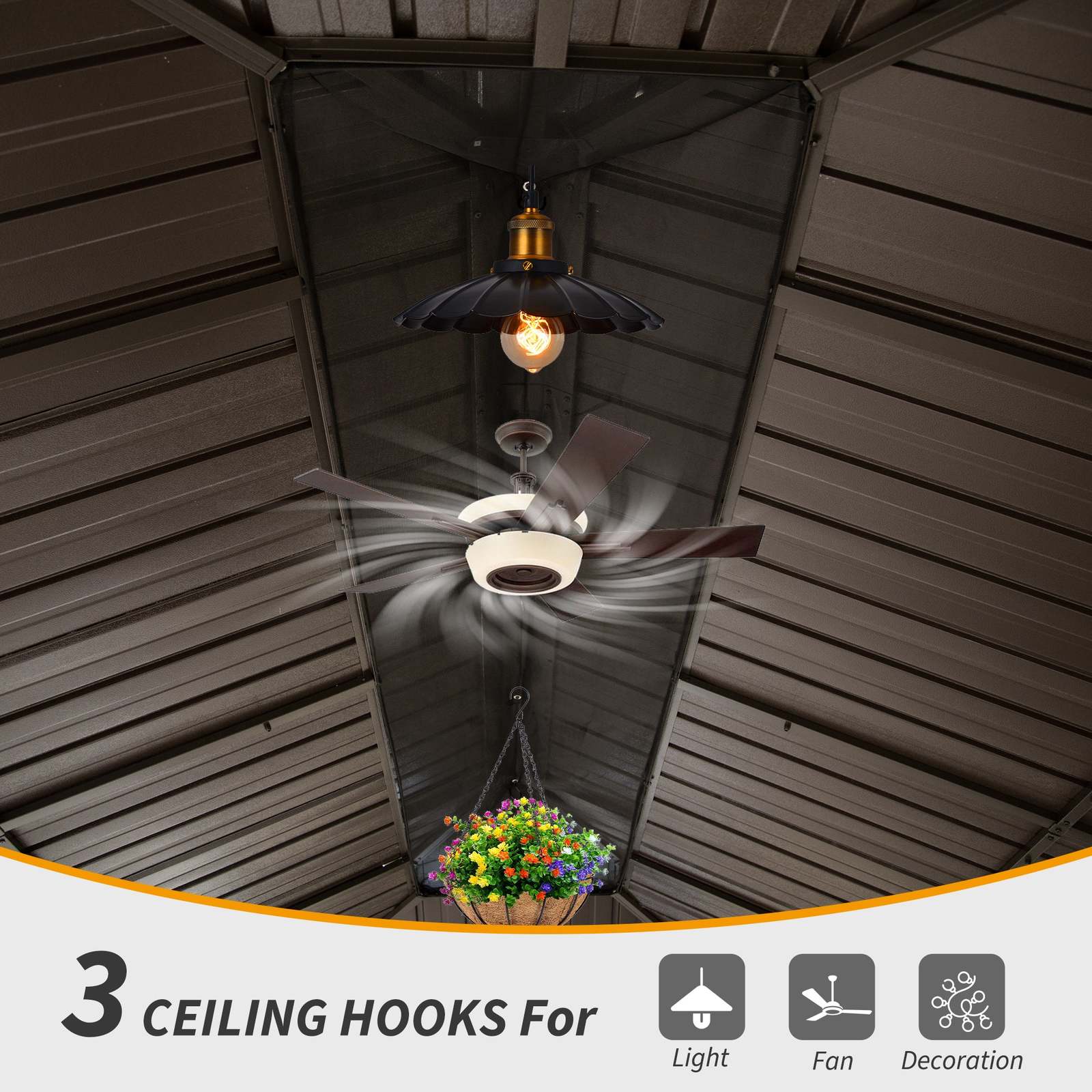[Versatile Hook Options for Personalization] With 3 versatile hooks, each holding up to 20 lbs, you can easily add lights, fans, or decorations to create a personalized outdoor oasis. Perfect for entertaining or adding ambiance, these hooks enhance your outdoor living experience.