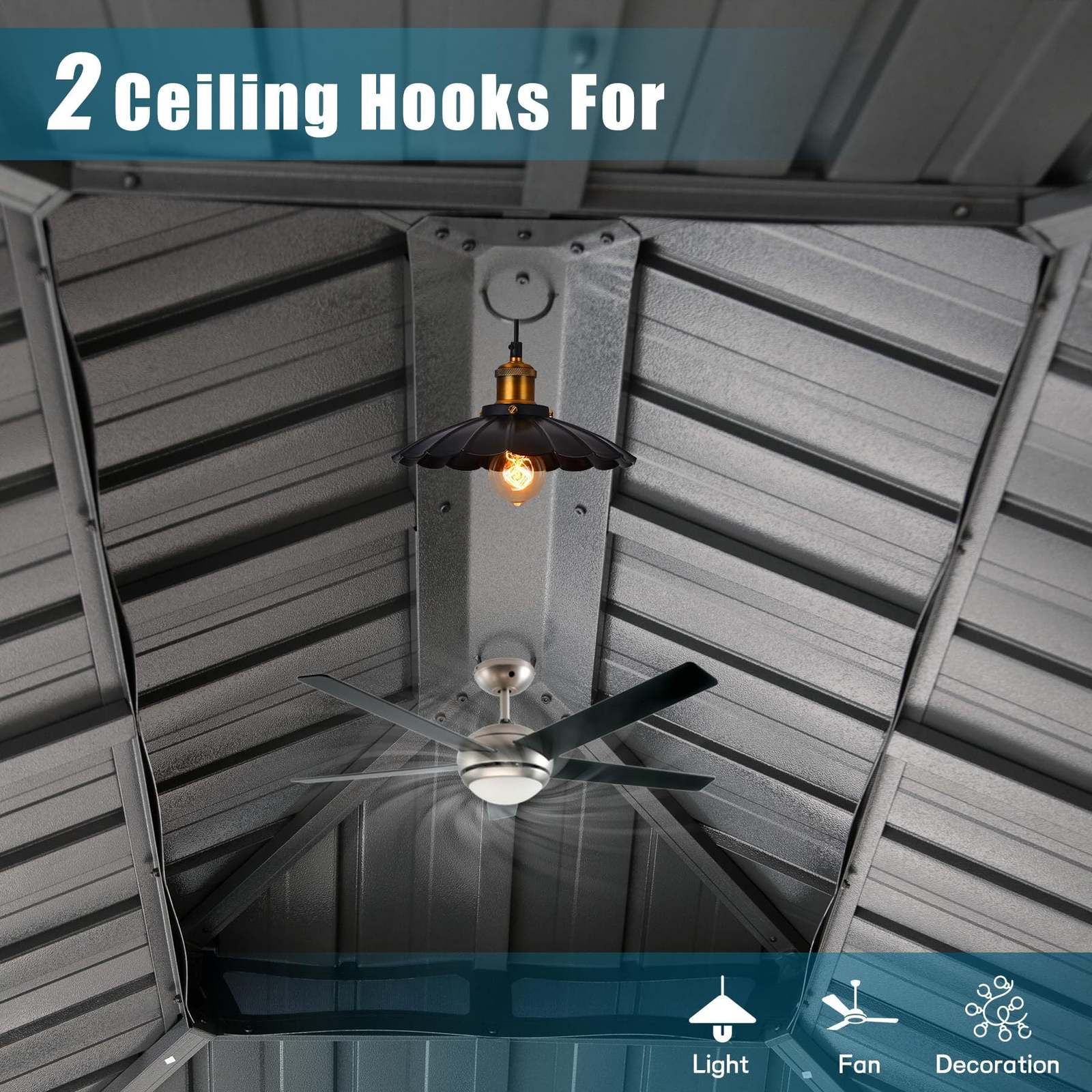 ??Effortless Ambiance with Sturdy Hooks- Elevate your hard top gazebo's functionality with 2 sturdy hooks! Each hook can effortlessly support up to 20 LBS, making it easy to hang lights, fans, or decorations. Create your ideal outdoor ambiance effortlessly.