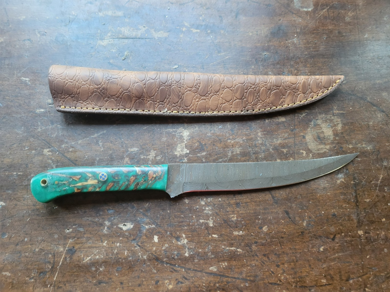 - 13.5" Damascus Steel Hunting Skinning Knife Composite Handle Leather Sheath