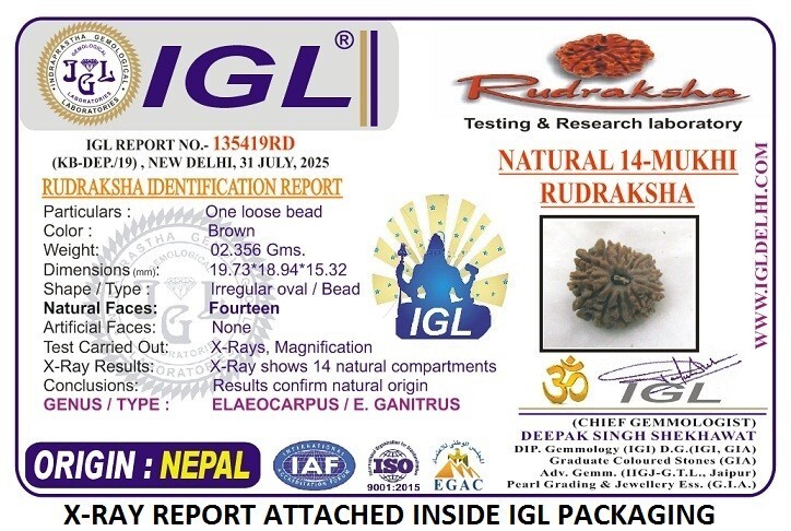 - 14 Mukhi Rudraksha / Fourteen Face Rudraksh - Nepal - 19.73 mm - IGL Certified