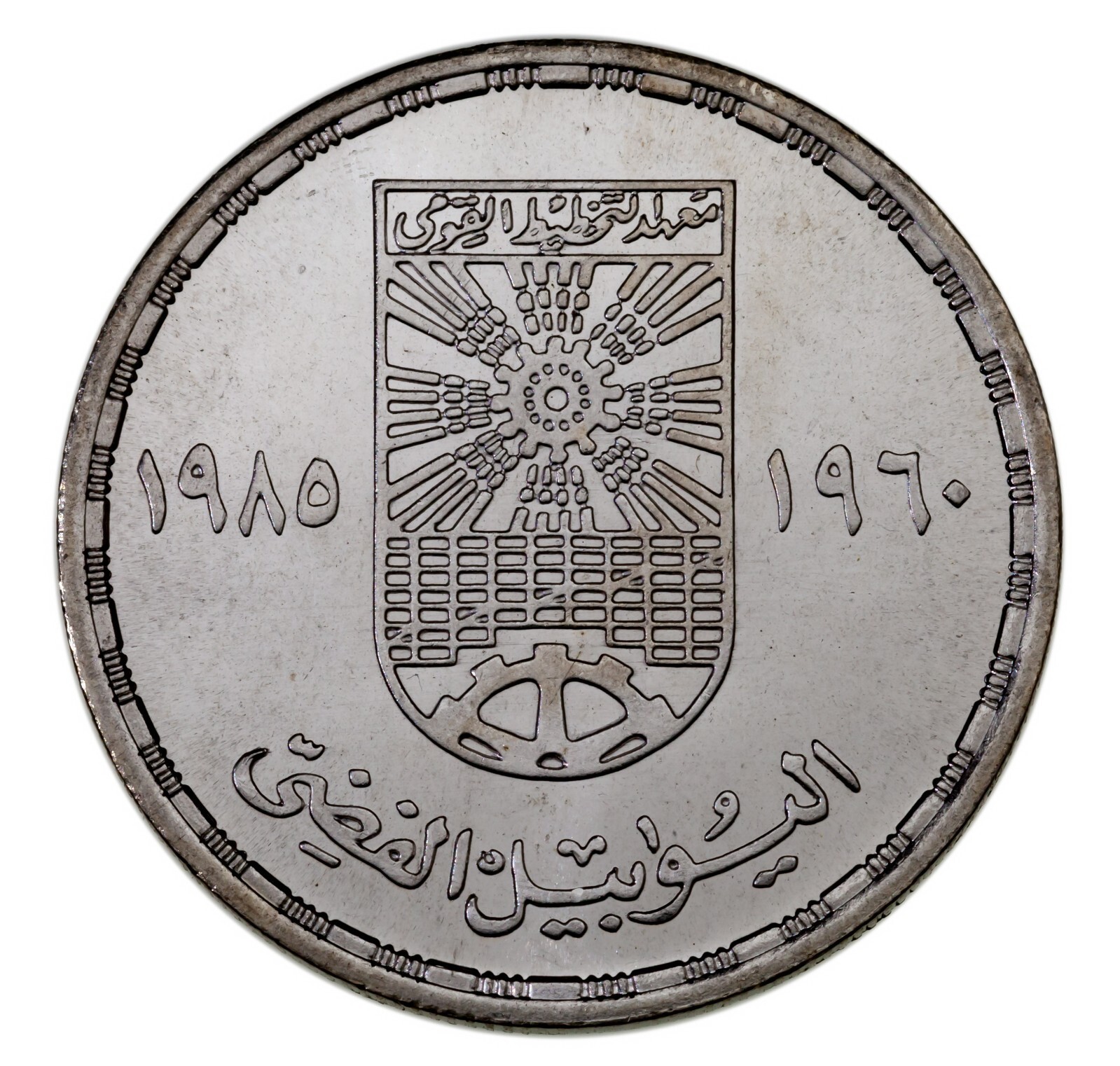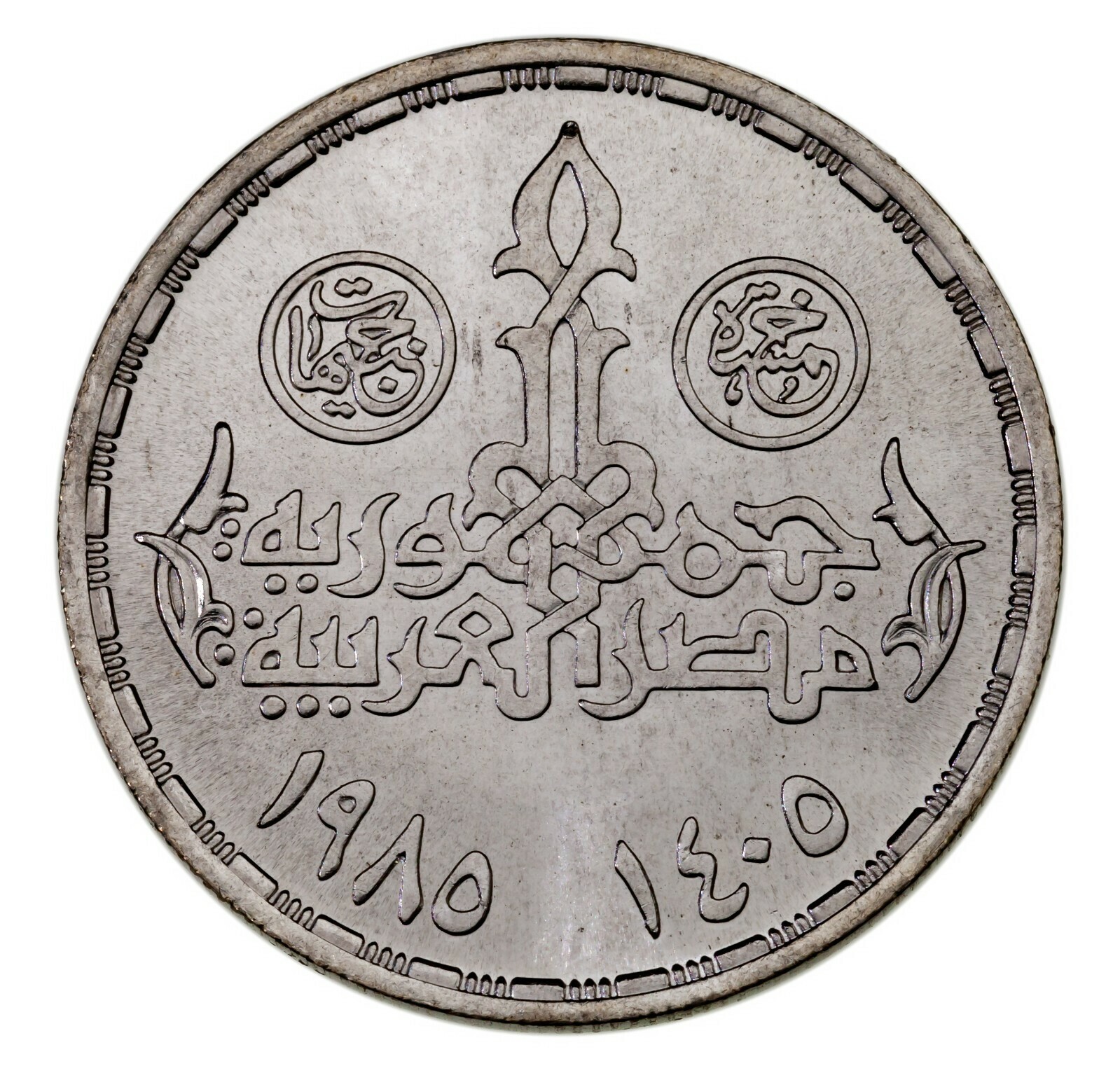- 1405-1985 Egypt 5 Pounds Silver coin in BU, 25th Anni. Planning Institute km 572