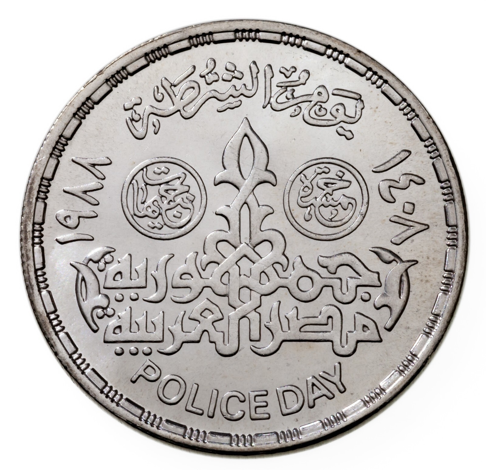 - 1408-1988 Égypte 5 Pounds Pièce Argent En Bu, Police Jour Km 621