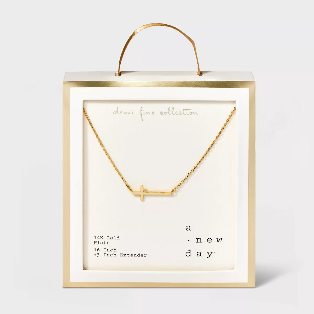 Get inspired with the 14K Gold Plated Stationed Cross Pendant Necklace from A New Day. This gold-plated necklace features a cross pendant dangling at the center of the linked chain for a beautiful look. Designed with an extender chain for length customization, this cross necklace closes with lobster-claw clasp, and suit all types of skin with its nickel-free design.