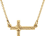 This beautifully designed necklace is crafted from your choice of either 14K Yellow Gold, 14K White Gold or 14K Rose Gold. It features a sideways cross done in a rope design. The pendant hangs from a 16.5" long cable chain with a spring ring closure.